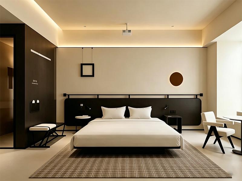 作为成都核心商圈的重要载体,天府广场周边的酒店空间设计,既要兼顾商务客群的高效需求,也要为城市旅人打造一处能卸下疲惫的精神自留地。本次 800㎡酒店装修设计,以 “克制的极简主义” 为核心,将黑、白、米三色作为空间主调,用成都专业酒店装修的精细化施工标准,打造出兼具质感与温度的居住空间,成为天府广场区域公装设计的新范本。