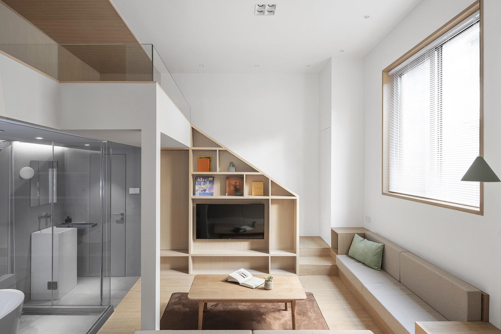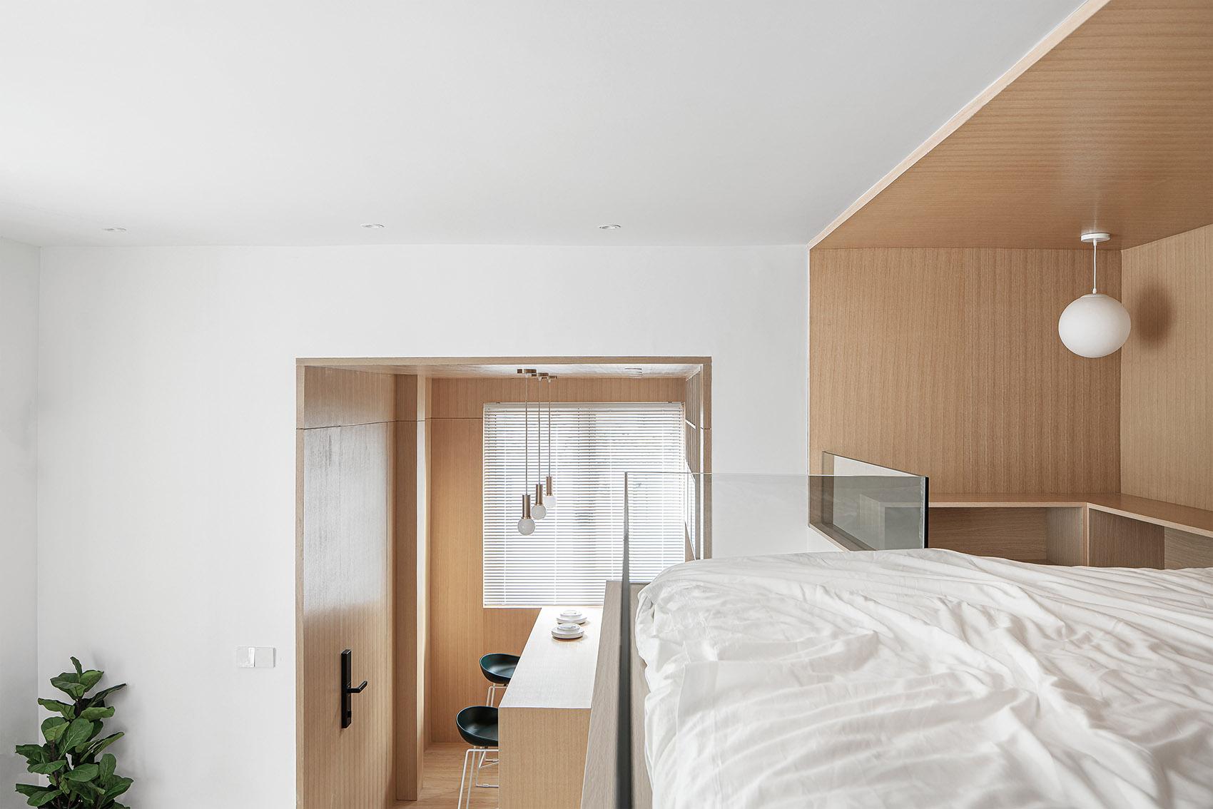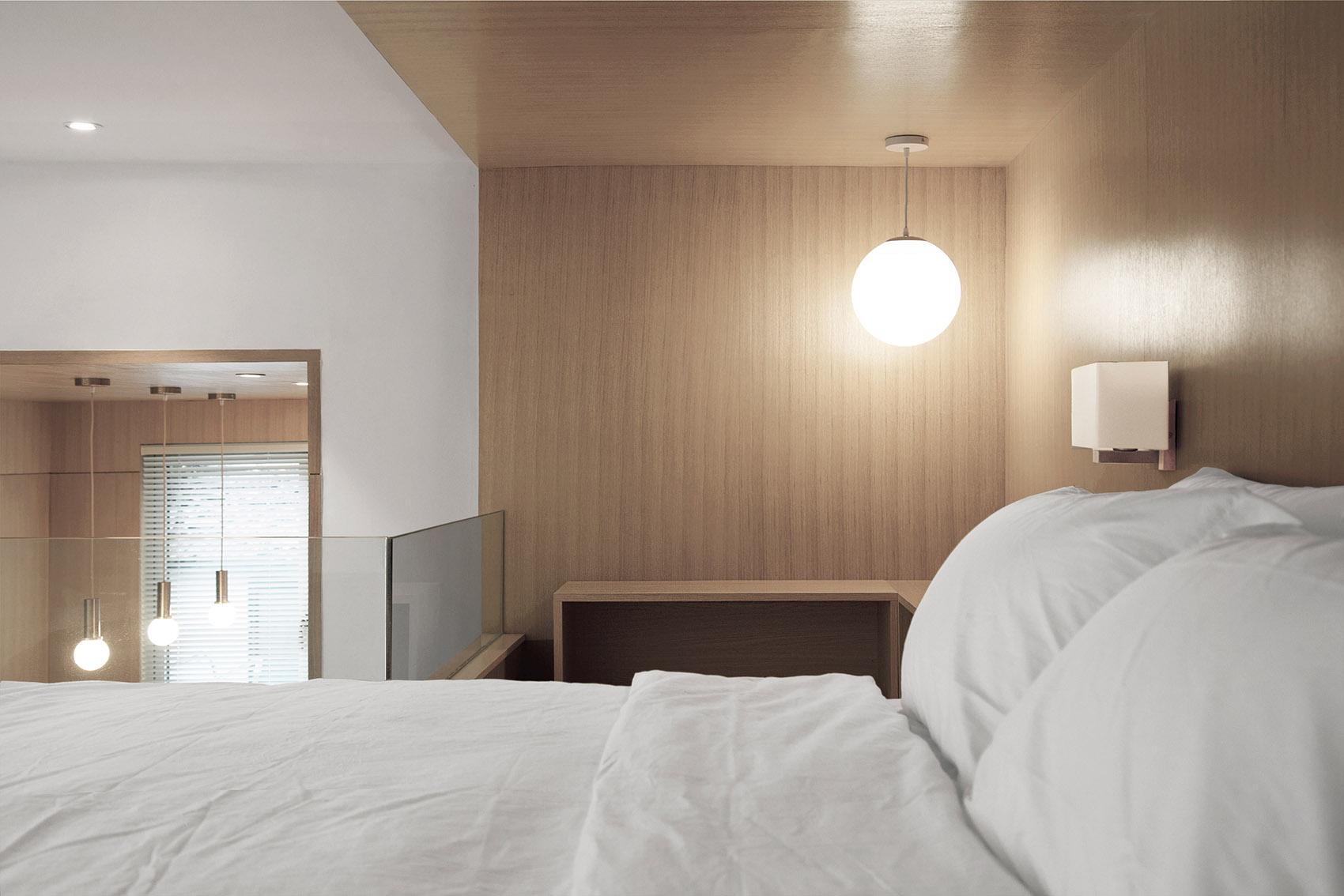 空间利用上,采用了 loft 结构,这是工装设计中优化垂直空间的巧妙手法。睡眠区被设置在二层,既充分利用了空间,又营造出独特的居住体验。为保障安全,同时不破坏空间的通透感,选用了玻璃护栏。玻璃的通透特性,让二层与一层视觉上相互连通,光线能自由穿梭,使整个空间更显开阔,仿佛与龙泉山的山野景致融为一体,旅客在睡眠区也能隐约感受到山下的生机与活力。一层则紧凑且合理地规划了客厅、厨房、卫浴等功能区,各区域既相对独立,又通过开放式的布局形成有机整体,方便旅客在不同功能区之间活动,契合民宿作为临时 “家” 的属性。
