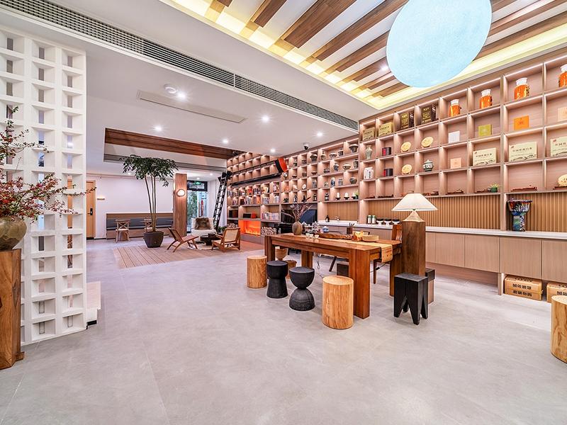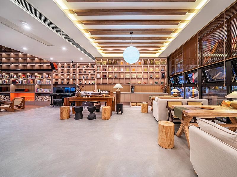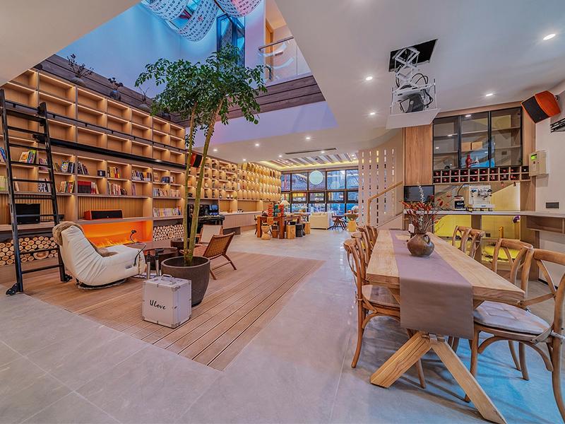 从呈现效果能清晰察觉到,该酒店在推进酒店装修方案落地时,深度考量了空间氛围营造与实际功能的融合统一。 在工装设计范畴,整体采用以木质元素为主导的装修风格,木材天然的纹理以及温润的质感,为整个酒店构建出温馨且自然的氛围,仿佛具备一种魔力,能让住客一踏入酒店,就瞬间卸下旅途奔波带来的疲惫感。公共区域(诸如大厅)的装修设计方案颇具巧思,错落有序地布置着书架,上面满满当当陈列着各类书籍,还有造型简约却不失格调的桌椅,既具备休闲属性,又蕴含文化气息,精心打造出一个可供人们放松阅读、畅快交流的空间。