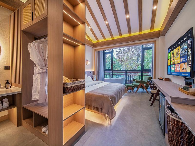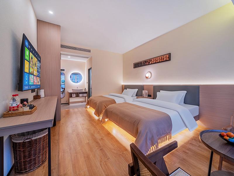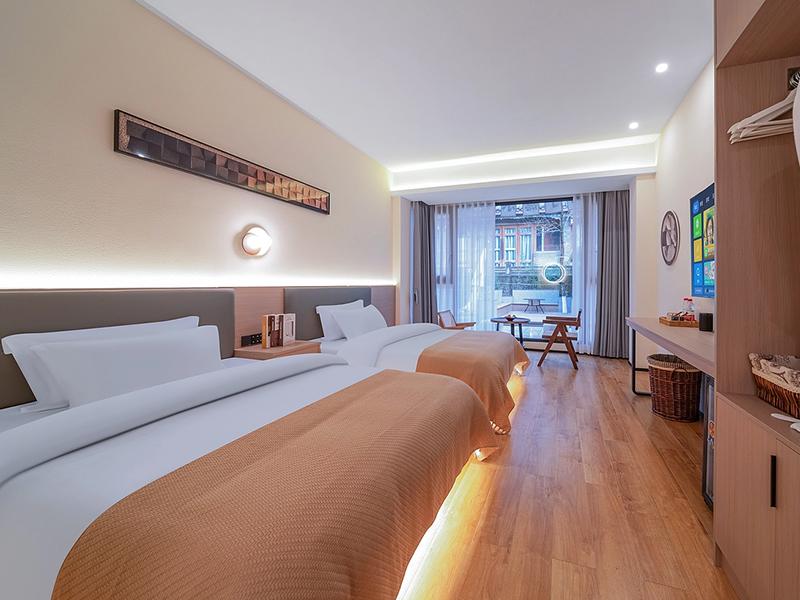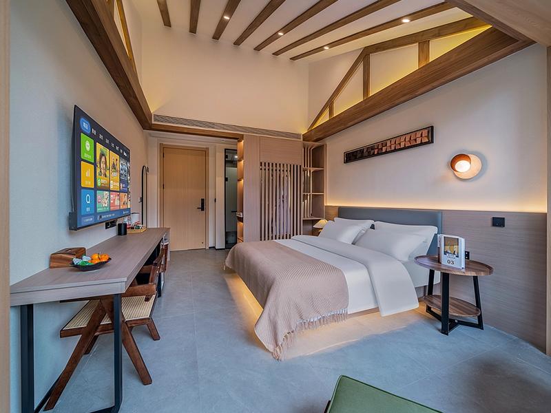 在这里,住客既能享受独处时的静谧时光,沉浸于书海;也能与朋友、家人围坐在一起,分享旅途过程中的见闻与感受。 客房部分同样是装修设计方案的亮点所在,有着不同的类型,既有大床房,也有双床房。房间内部设施十分齐全,舒适的床铺仿佛能将人瞬间包裹,为住客带来优质的睡眠体验;高清电视可充分满足住客休闲娱乐的需求;实用的书桌则为商务出行的住客提供了便利,方便他们处理工作事务。