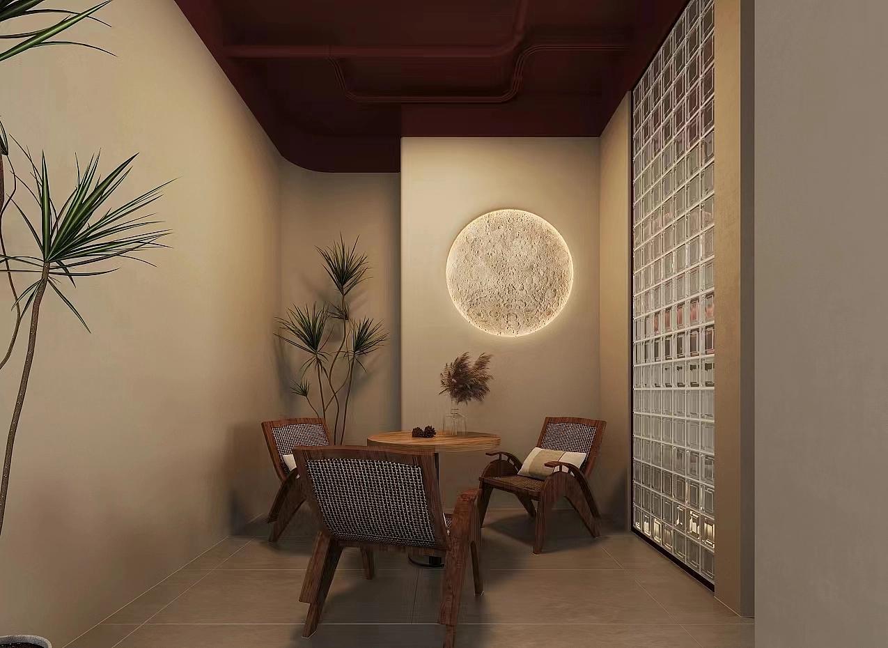 艺术化的墙面处理同样值得关注,“月球” 造型的艺术墙饰以粗糙的质感呈现,搭配内嵌灯光,成为空间的视觉焦点,为顾客提供了极具记忆点的打卡场景,也为工装空间注入了艺术气质。