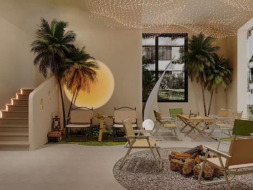 为避免暖调过于厚重,设计在点缀色上巧思频出:户外区域的彩色小桌、室内的红色吧台凳,以及墙面装饰的彩色圆形吊灯,如同跳跃的音符,为空间注入灵动活力,让 80 平米的空间在视觉上更具层次与张力。