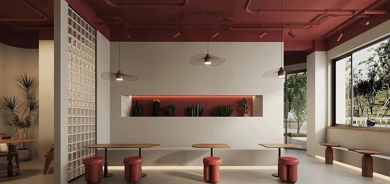 空间以暖米色墙面奠定柔和的视觉基底,搭配原木材质的自然肌理,从视觉到触觉都传递出温润感,瞬间消解都市人的疲惫。顶面大胆采用复古红棕色,将暴露的管道系统统一包裹其中,既保留了工装空间的工业感细节,又通过色彩的复古调性,营造出 “巷弄深处的岁月感”,与 “北巷” 的品牌名称形成情感呼应。