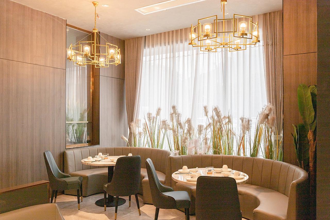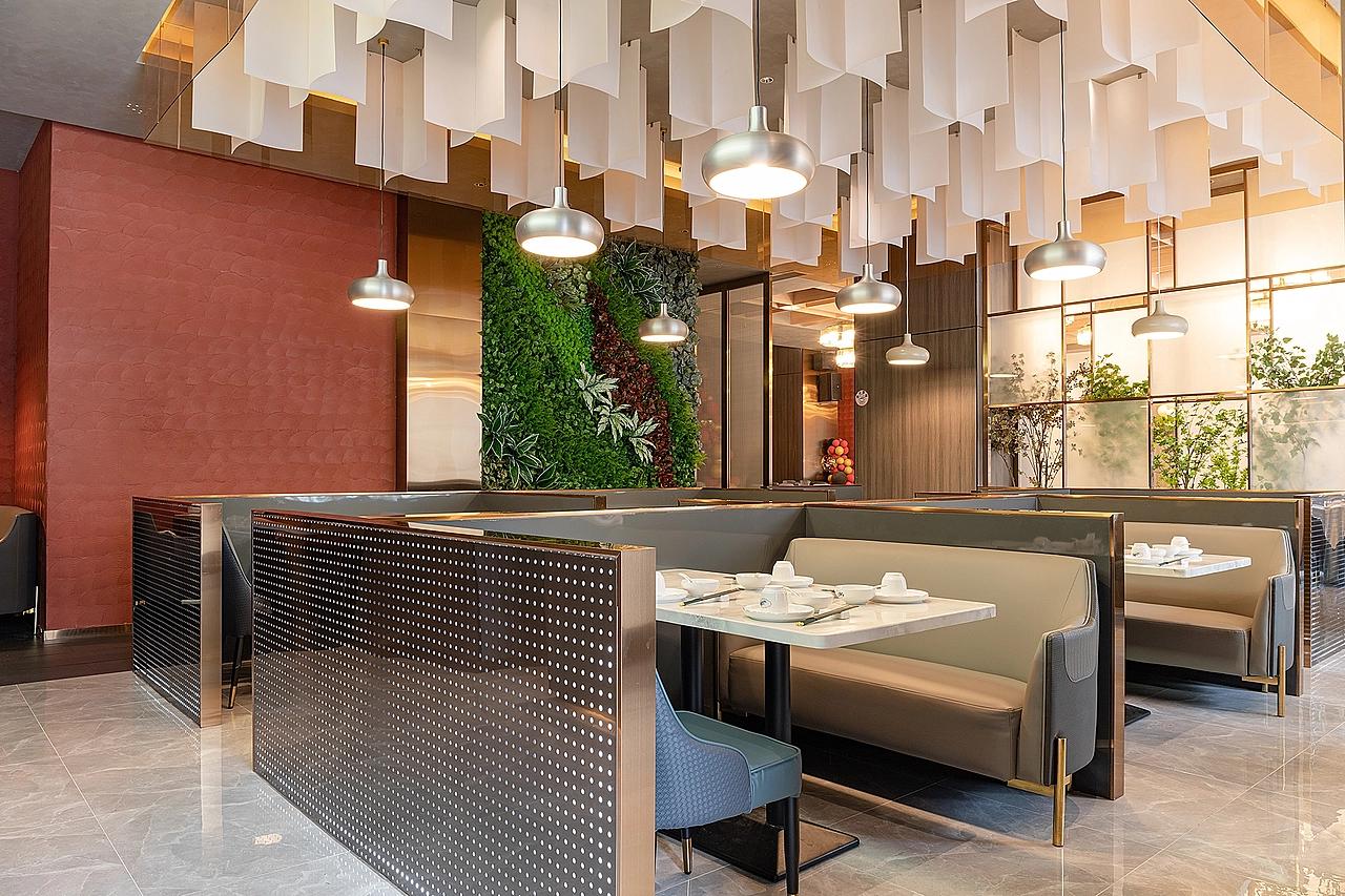 采用开阔式布局,多个圆桌单元有序排列,顶部木质格栅与金色吊灯形成矩阵式组合,既强化了空间的纵深感,又通过金属材质的奢华感提升宴席氛围,适配大型婚宴、企业团餐等场景。卡座区:以金属穿孔隔断划分半私密空间,软包卡座搭配简约金属吊灯,营造出适合情侣约会、好友小聚的休闲氛围。卡座区的垂直绿植墙与大理石餐桌形成 “软 - 硬”“自然 - 人工” 的材质对话,让空间更具呼吸感。