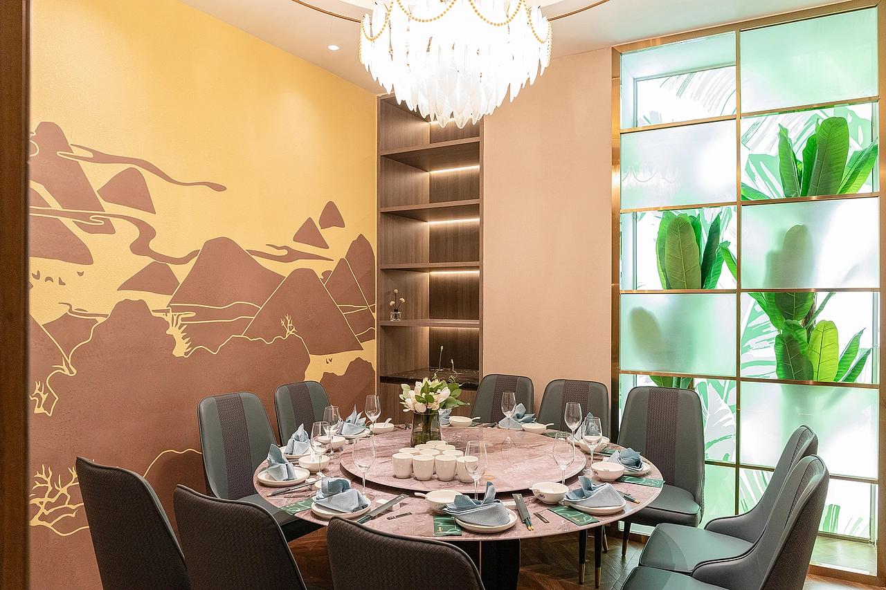 800 平的空间被精准划分为包厢区、大厅区、卡座区、走廊过渡区四大功能模块,实现 “私密 - 社交 - 休闲” 的全场景覆盖。以独立包厢为核心,圆形大理石餐桌搭配高定灰色餐椅,满足商务宴请的私密性需求。墙面的山水抽象艺术画,以极简线条复刻中式山水意境;羽毛状艺术吊灯与几何金属灯的搭配,让包厢在 “新中式” 的雅致中融入轻奢质感,成为家庭聚餐、高端商务洽谈的理想场域。