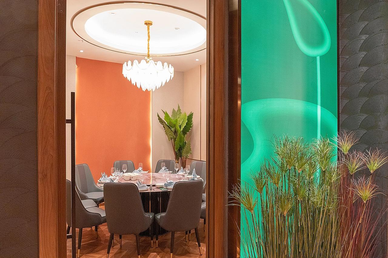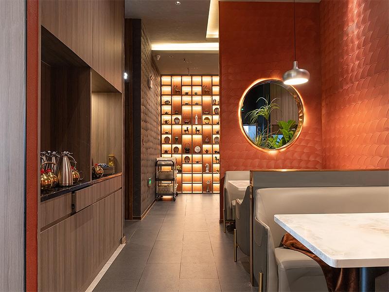 色彩方案以 “暖调为主、点缀为辅”,通过色彩的层次变化引导食客的情绪流动。焦糖色、橘红色墙面成为空间的 “暖场主角”,搭配灰色、米色的家具,既营造出中餐厅应有的烟火气与温馨感,又通过中性色的调和避免了暖色调的过度甜腻,让空间更具高级感。绿色的 “自然属性” 呼应新中式的山水意境,蓝色的 “冷静属性” 则为轻奢风格增添现代感,二者共同让空间色彩更具层次与活力。