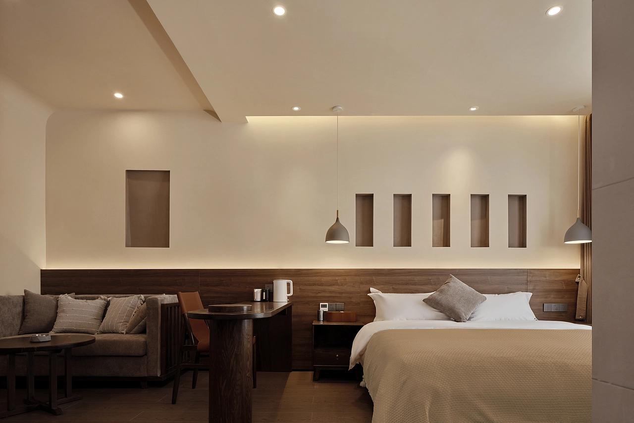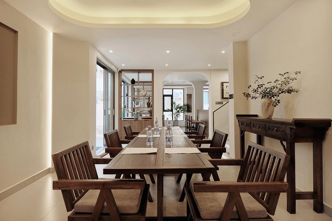 1200 平的空间被划分为公共交流区、客房区、休闲配套区三大功能板块,在满足民宿 “居住 + 社交 + 休闲” 复合需求的同时,通过中式空间的 “起承转合” 营造出层层递进的意境。以开放式布局为主,如会议室采用长形实木桌搭配中式风格座椅,上方弧形吊顶灯带柔化空间线条,一旁的木质置物架以玻璃隔断区分区域,既保证了交流的开放性,又借由传统条案、绿植陈设传递出中式会客的仪式感,让客人在现代空间中感受 “以茶会友” 的中式社交文化。