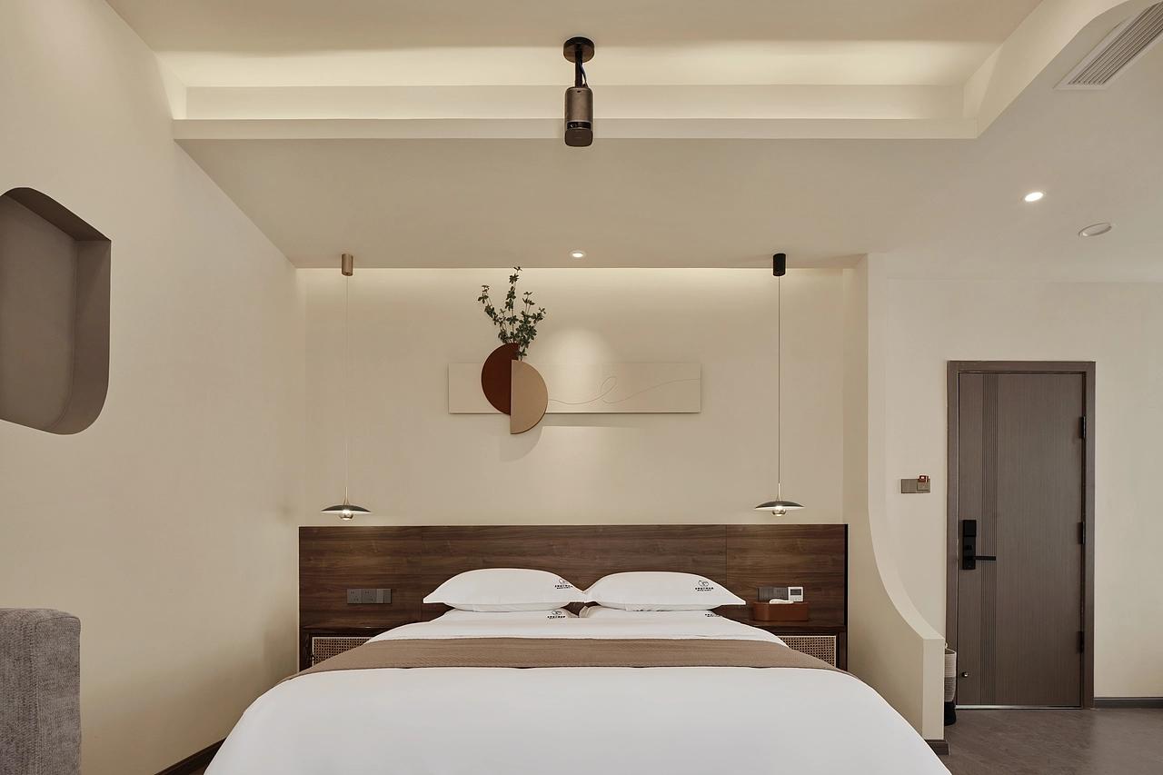 艺术与灯光的氛围营造:墙面的圆形木质花艺装置、抽象线条装饰画,为空间注入艺术气息;嵌入式筒灯、线性灯带、吊灯的组合运用,营造出层次丰富的光影效果,恰似中式园林的 “移步换景”,让空间在白天与夜晚呈现出不同的质感,满足现代旅居者对 “美学生活” 的追求。