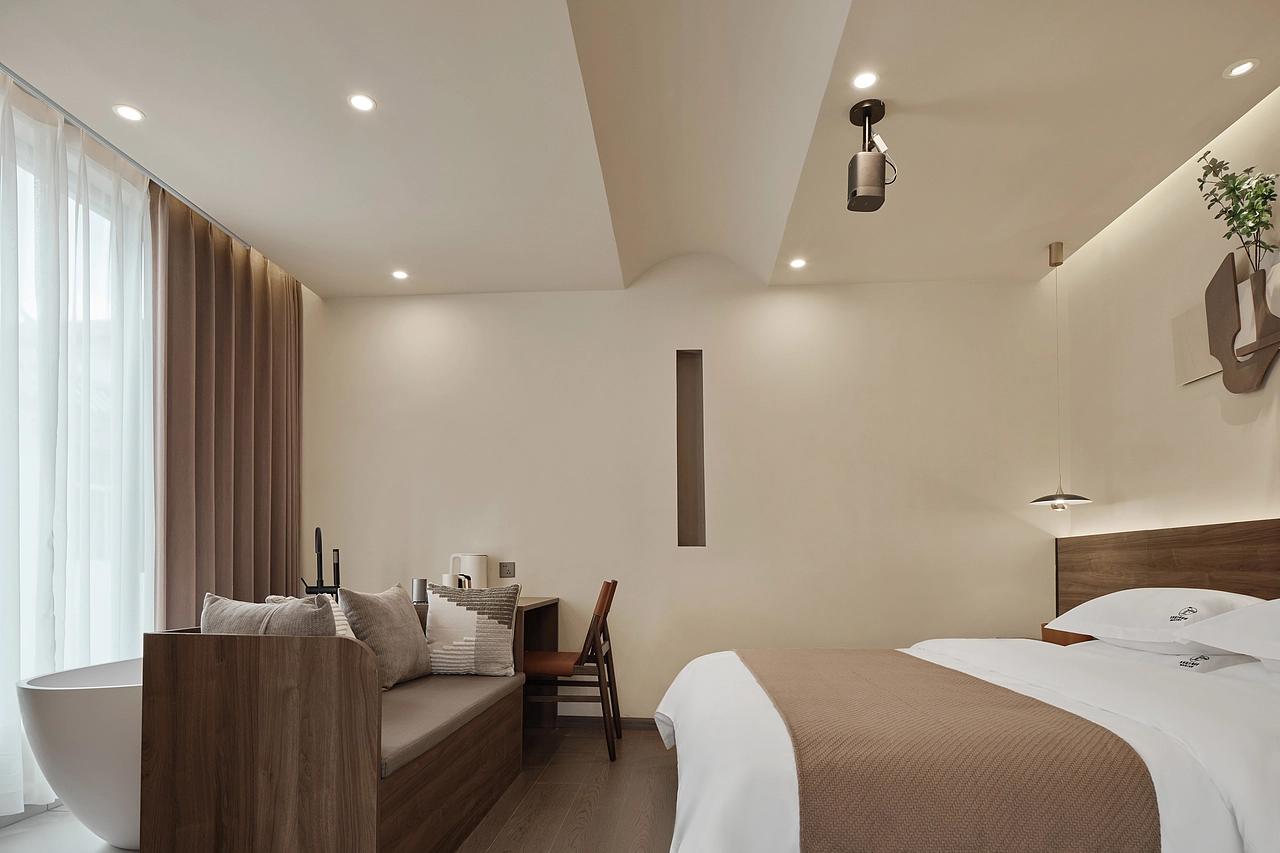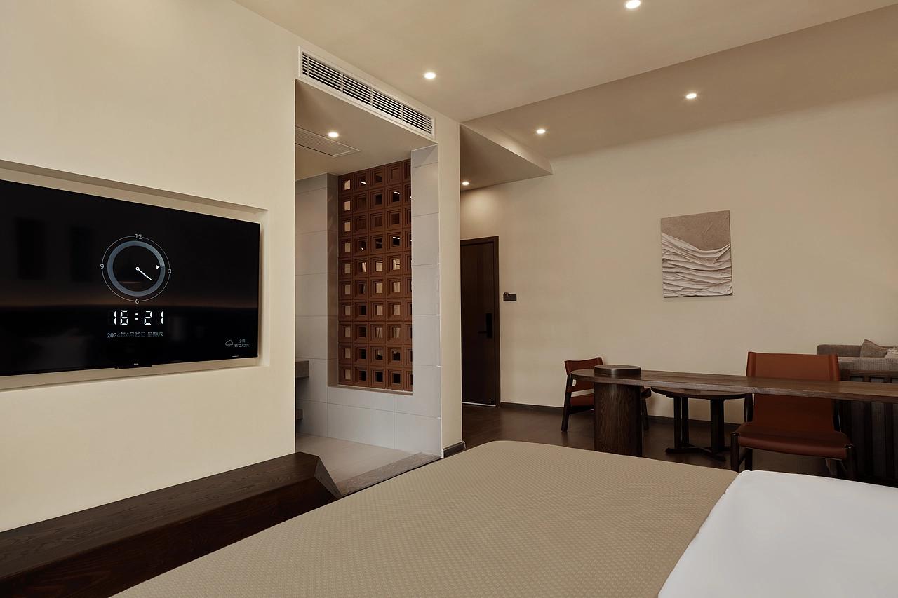 大量选用胡桃木等深色实木,应用于家具、墙面装饰。实木的天然纹理与温润触感,传递出中式风格的 “木韵”,如客房中榫卯结构的座椅在现代工艺下还原传统家具的结构之美,既保证了实用性,又成为空间中可触摸的文化符号。浴室台面采用灰色水泥质感材质,搭配圆形艺术洗手盆,工业风的利落与中式器物的雅致在此交融;地面的浅色瓷砖则提升了空间的明亮度,让卫浴区在实用之外更具设计感。