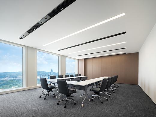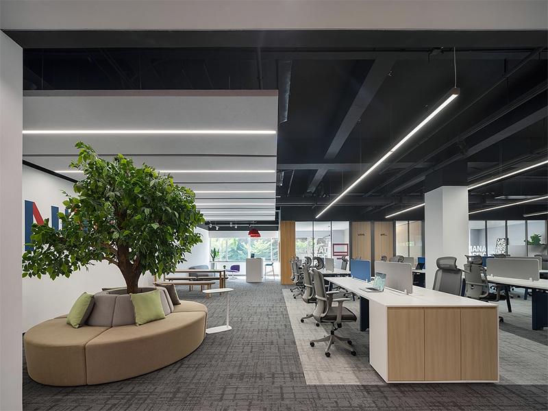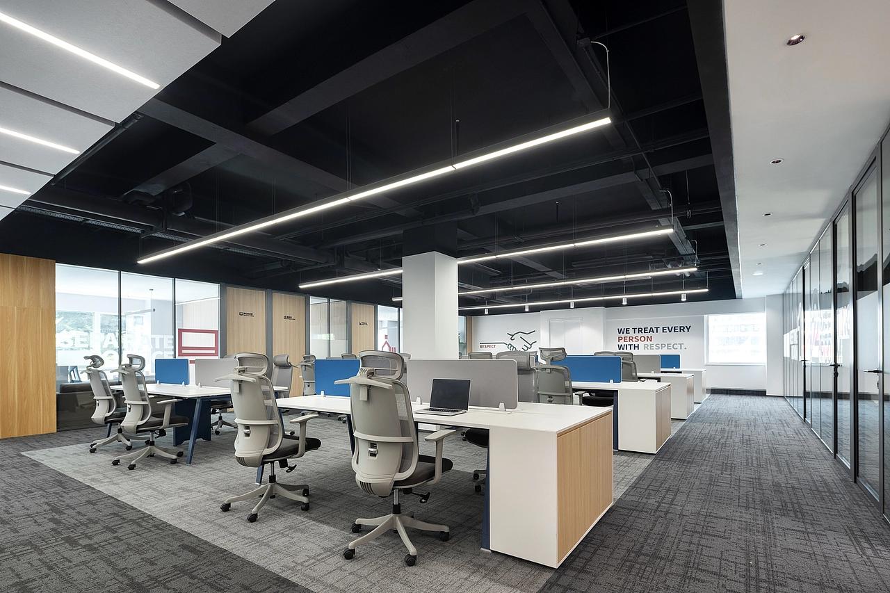 开放式工位布局遵循 “高效协作” 原则,浅木色家具搭配线性照明系统,让空间既通透明亮,又通过合理的工位间隔平衡 “团队协作” 与 “个人专注”。这种布局适配金融行业高频的信息流通需求,让交易、分析等工作在 “开放但不干扰” 的氛围中高效推进。