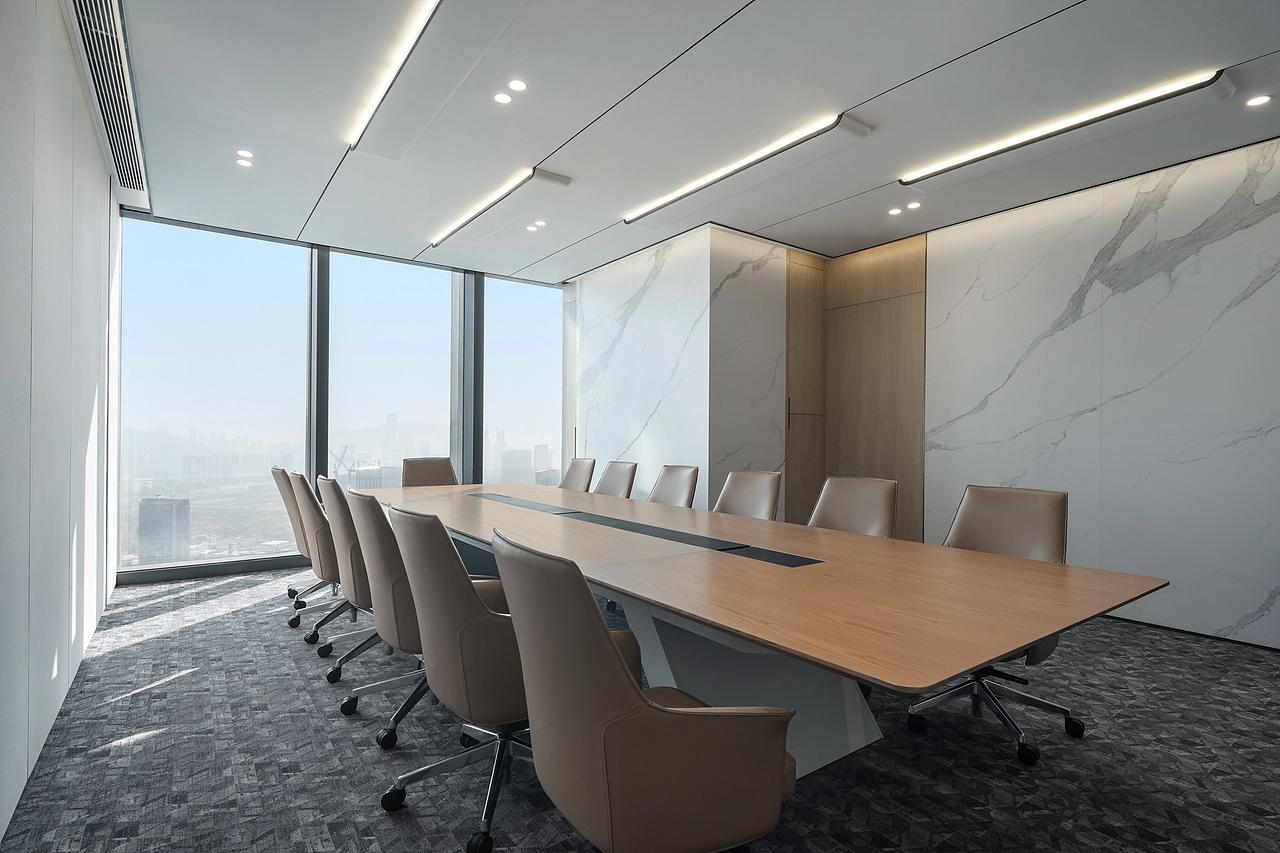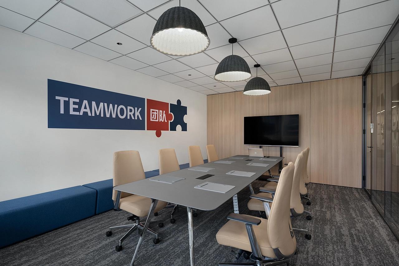 金融行业对会议的需求层次丰富,设计中也做了精准响应。小型会议室以 “TEAMWORK 团队” 为主题,拼图元素与标语墙强化协作文化,适配部门内日常复盘、策略讨论;大型会议室则以大理石墙面、全景落地窗塑造 “商务气场”,城市天际线为背景,完美承接重要客户洽谈、公司战略发布会等高端场景,让空间成为金融品牌实力的 “视觉背书”。
