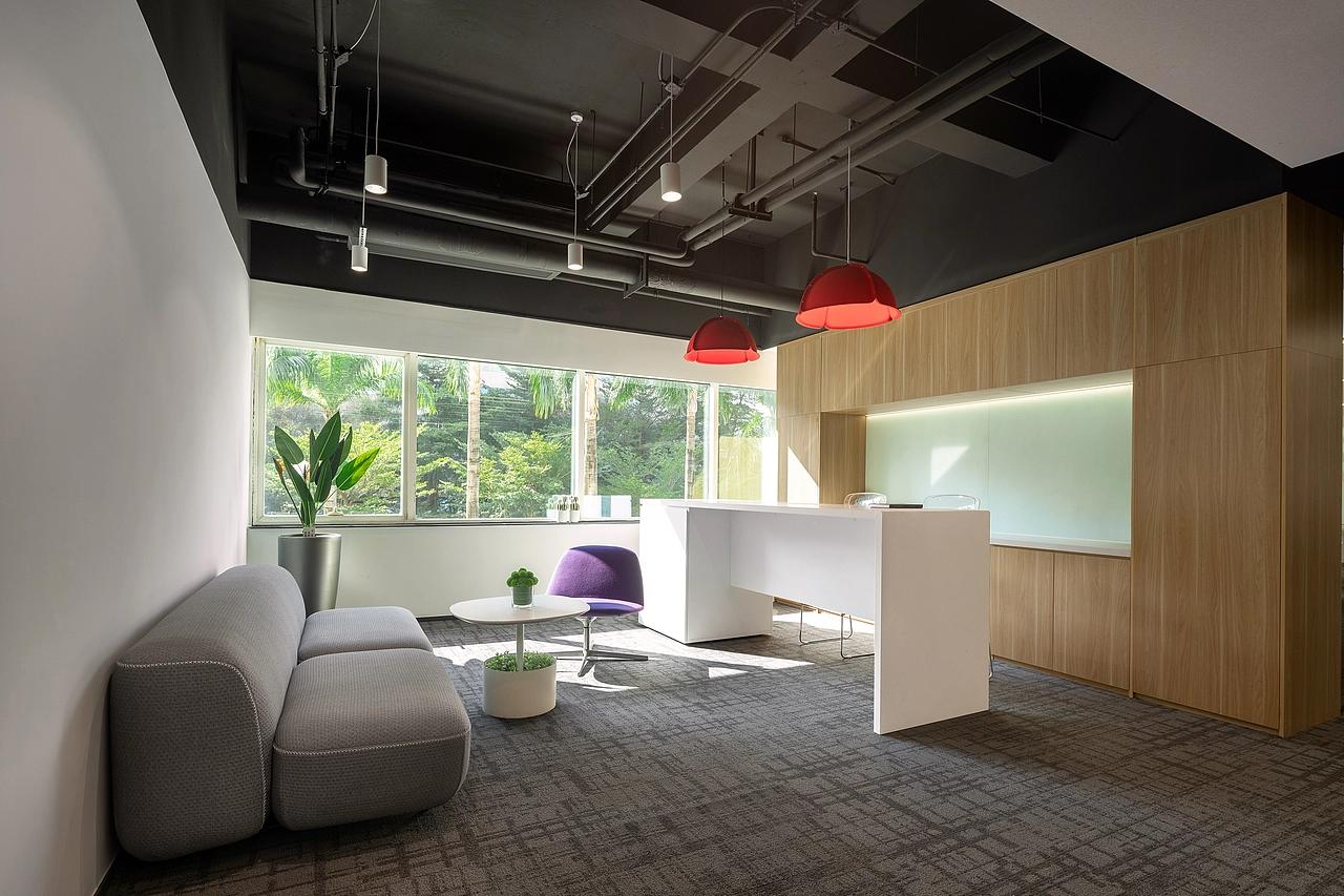 休闲洽谈区,灰色系沙发、创意紫色单椅与艺术感灯具的组合,搭配鲜活绿植,打造出 “非办公化” 的松弛空间。这里是员工短暂休憩的 “能量站”,也是商务洽谈的 “柔性场域”—— 金融合作的促成,有时正需要这样一处跳脱出 “刻板会议室” 的交流空间。