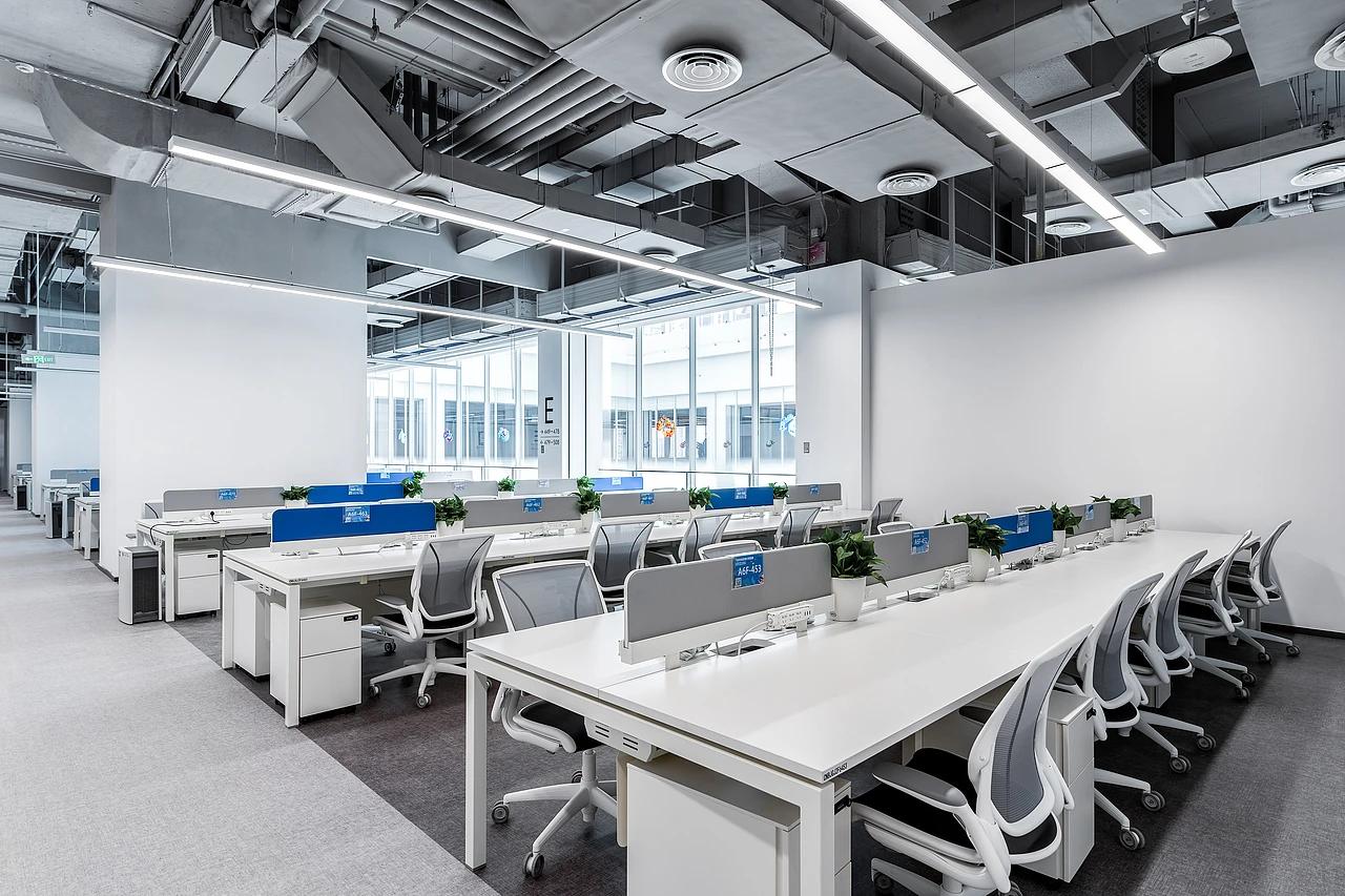 开放办公区是内容生产的 “主力阵地”。“极简白 + 浅灰” 的色调基底,营造出整洁、通透的工作氛围,让员工能快速聚焦于内容创作;统一风格的办公桌椅与模块化布局,既保障了团队协作的便利性,又通过蓝色隔断与桌面绿植的点缀,在开放空间中构建出 “半私密” 的个人工作域,满足 “团队脑暴 + 独立撰稿 ” 的双重需求;人体工学椅的配置则体现了对新媒体从业者 “长时间伏案工作” 的关怀,从硬件层面减少身体疲劳,提升创作效能。