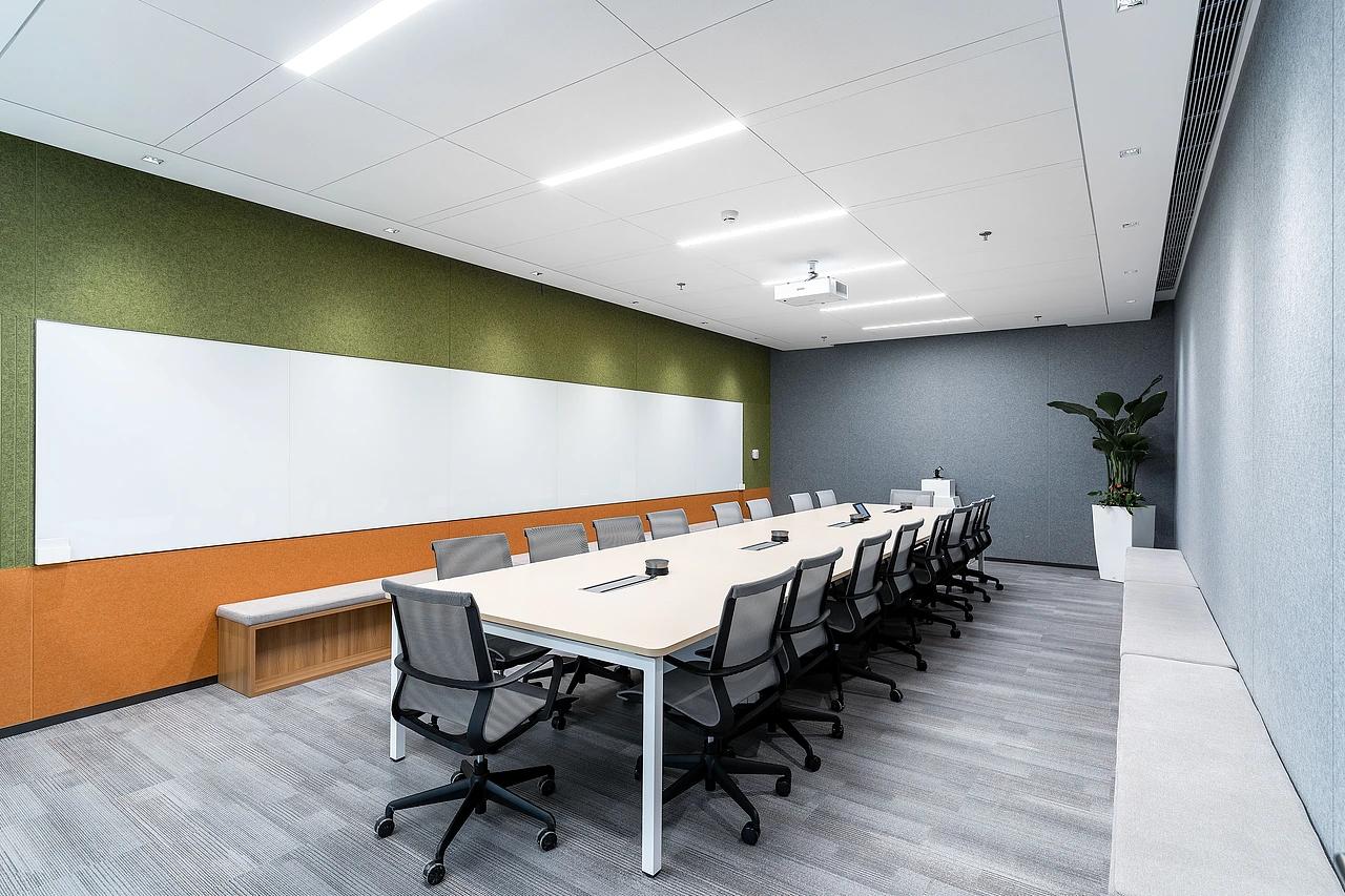 新媒体行业对 “协作性、创意性、时效性” 的需求,在空间设计中被拆解为四大核心功能区,彼此独立又联动。会议室是创意碰撞的核心场域。多色墙面拼接不仅划分出独立会议空间,更通过色彩心理学激活团队思维;长形会议桌与可移动办公椅的组合,可灵活适配 “头脑风暴会、项目评审会、客户沟通会” 等不同规模的会议需求;整面白板墙与吊装投影仪的配置,让策划方案的推导、画面分镜的梳理、数据报告的演示都能高效落地,成为新媒体内容从构思到执行的 “决策枢纽”。