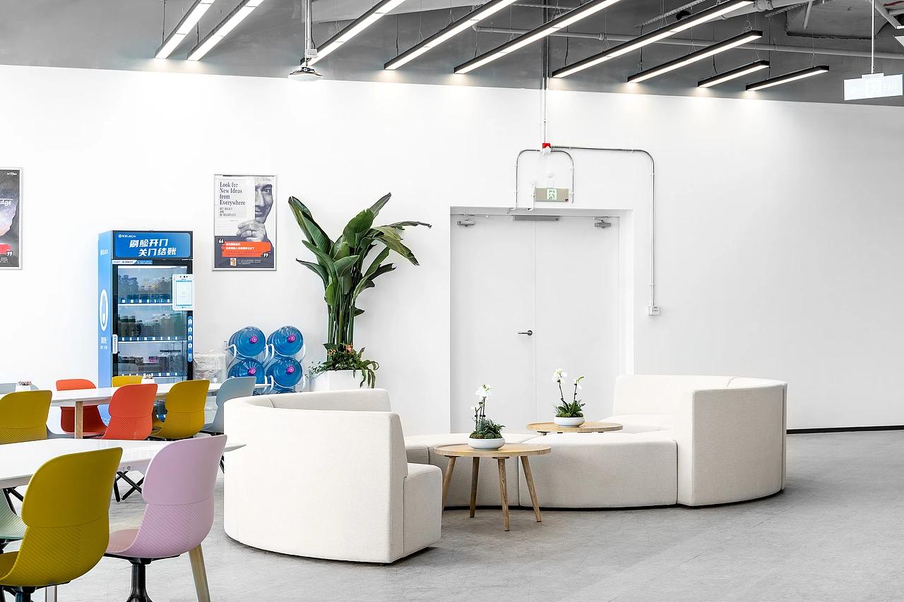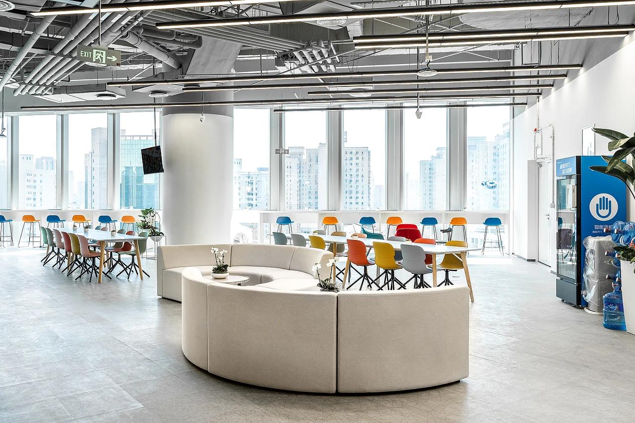 公共休闲区是创意沉淀与社交的 “能量场”。以 “色彩碰撞 + 灵活布局” 打破传统办公的沉闷:红、黄、蓝、粉等亮色座椅如同新媒体平台的多元内容,充满视觉张力;弧形布艺沙发与木质小桌的组合,既适合员工在忙碌间隙休憩放松,也能成为小型创意工坊的临时场地;大落地窗引入的充足自然光与城市景观,让员工在灵感枯竭时能借由环境触发新想法,完美契合新媒体行业 “灵感碎片化、创意即时性” 的特点。