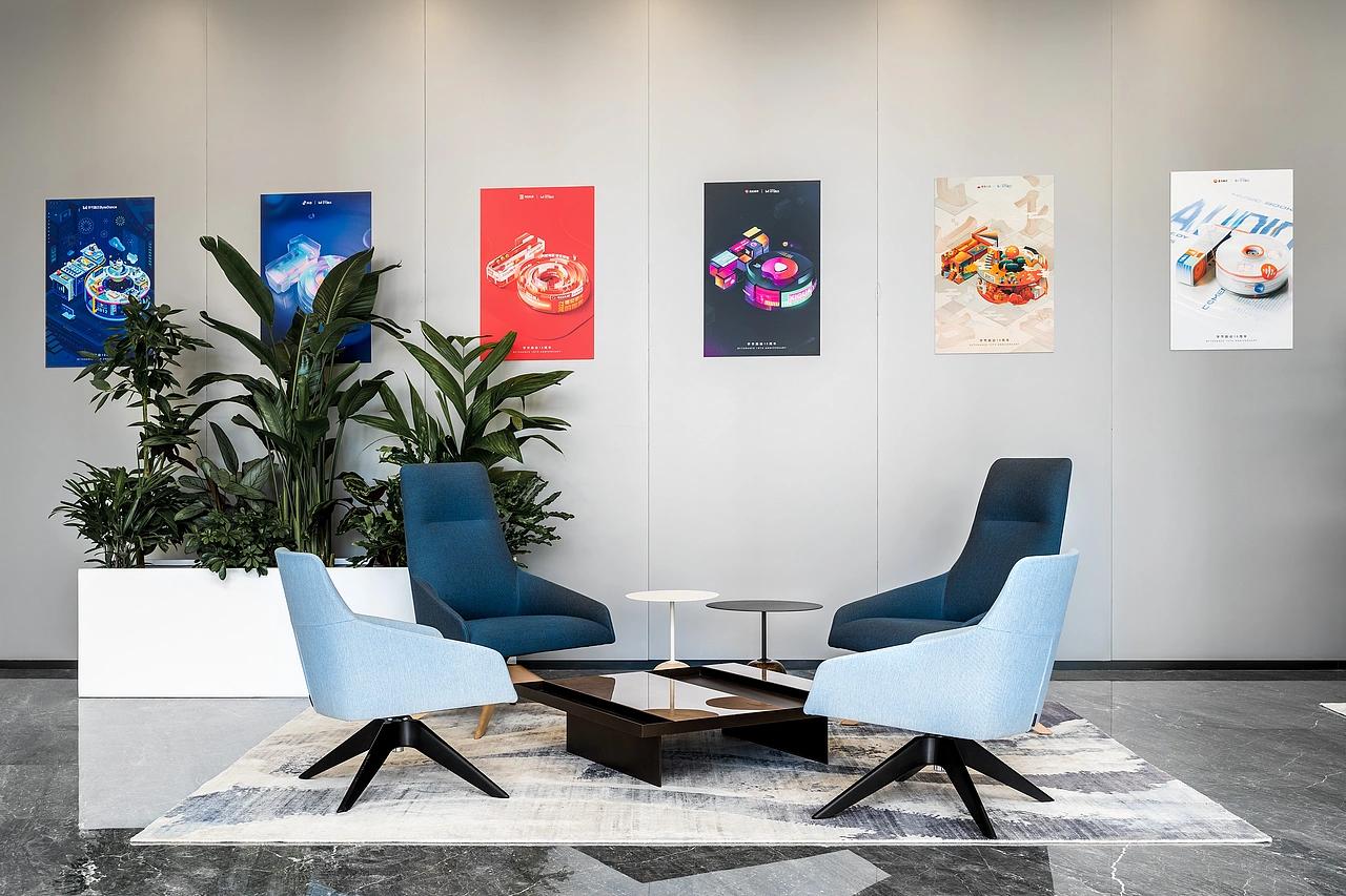 洽谈区是品牌形象的 “展示窗口”。以沉稳的蓝、灰色为主色调,搭配艺术感十足的新媒体主题海报与大型绿植,既传递出新媒体企业的专业度,又展现出创意属性;舒适的布艺洽谈椅与设计感茶几的组合,让客户在沟通品牌推广、内容定制等合作时,能直观感受到企业的审美力与执行力,成为业务拓展的 “隐形助力”。