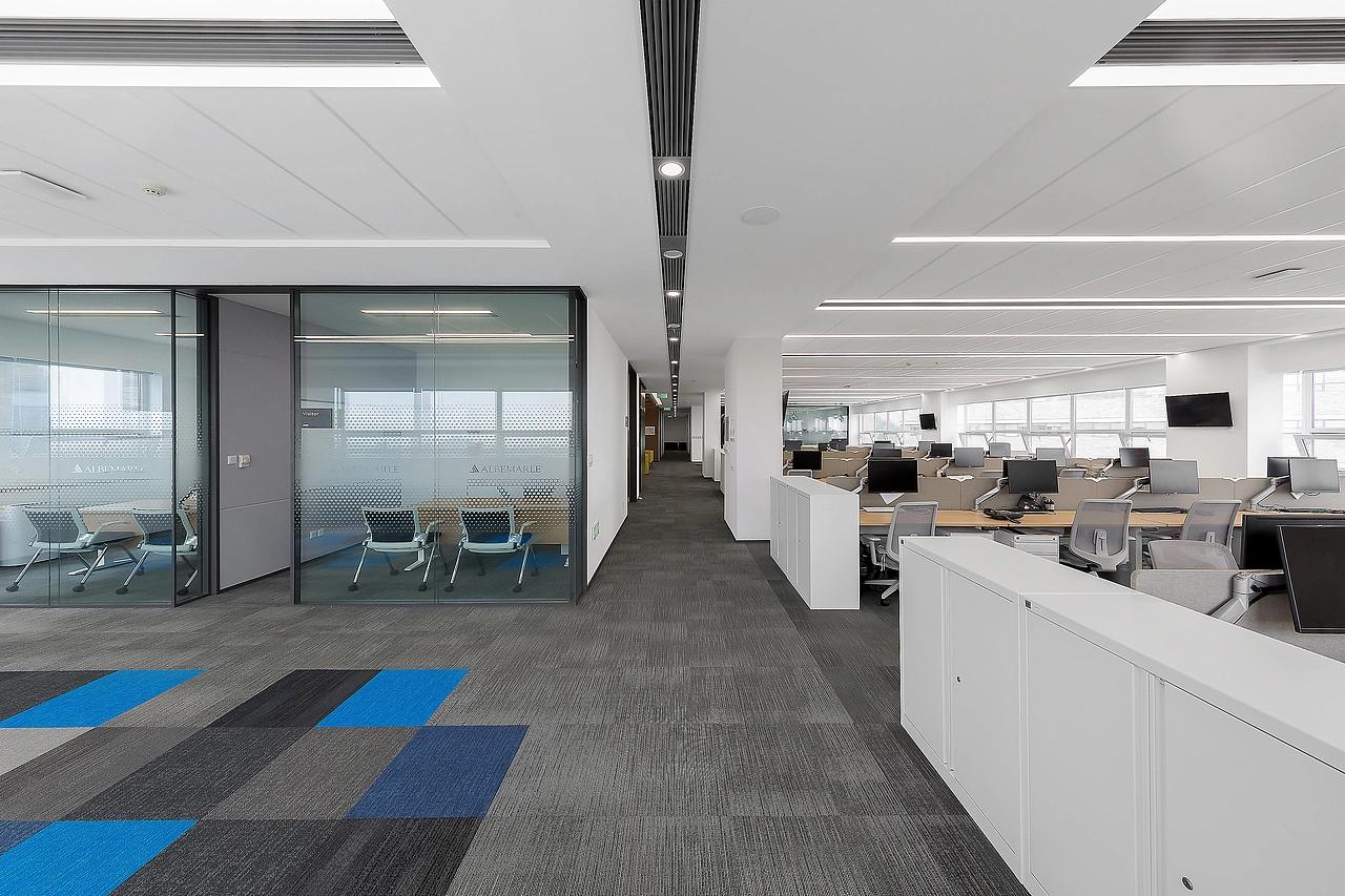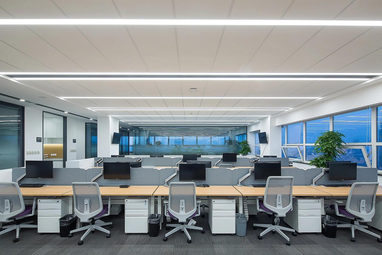 开放办公区的线性灯带沿吊顶规整排布,形成 “光的网格”,为客服人员处理工单、接听客户来电提供充足且均匀的基础照明,避免光线死角影响工作效率;休闲协作区、走廊的嵌入式筒灯则聚焦重点区域,营造层次化光环境,让客服人员在交流时能保持视觉舒适,也为空间增添了几分精致感。同时,设计充分利用国际金融大厦的建筑优势,以大面落地窗引入充足自然光线,不仅减少了人工照明的能耗,更让客服人员在长期伏案工作中能通过开阔视野缓解视觉疲劳,间接提升了团队的工作续航力。
