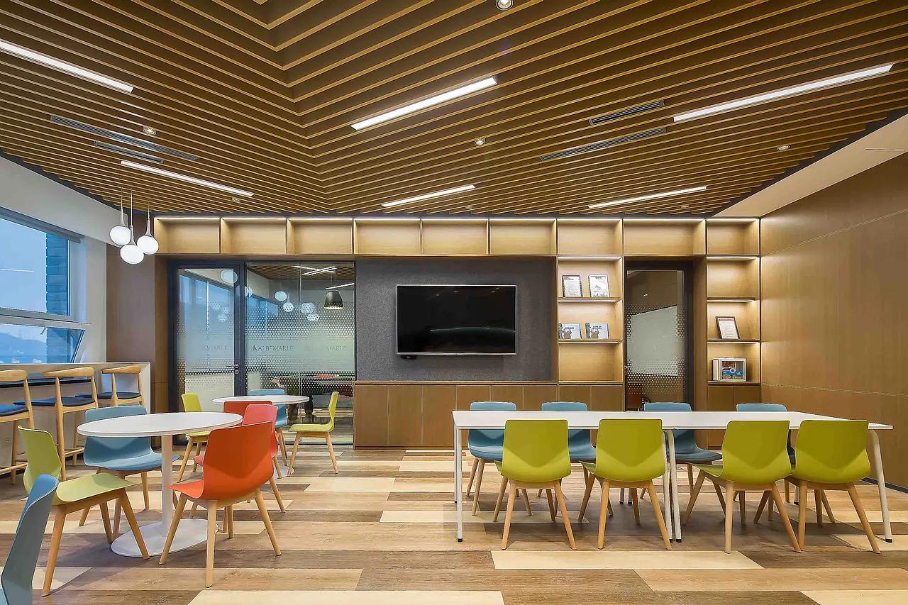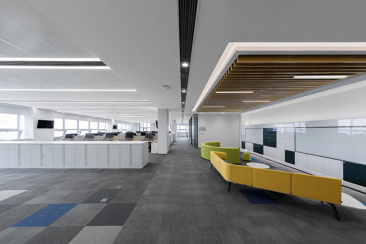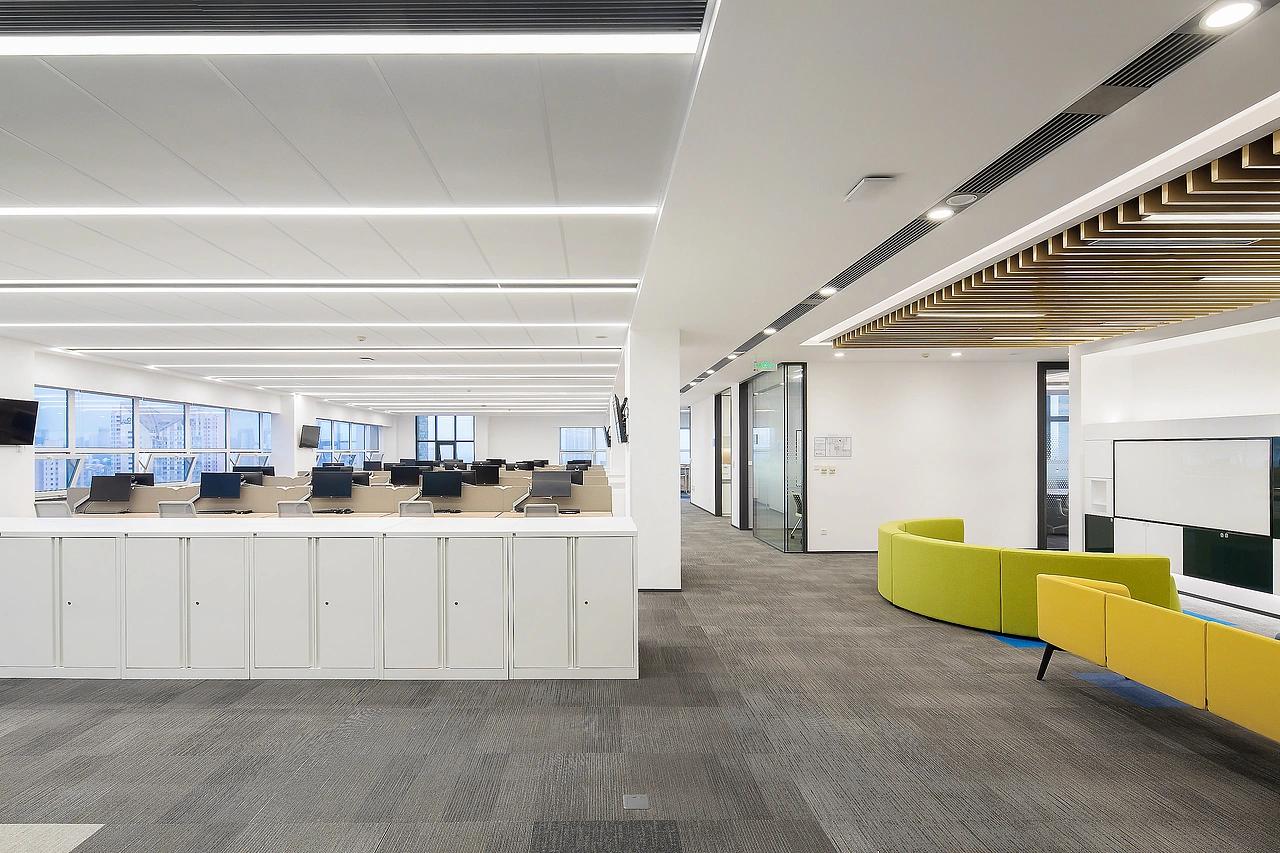 大面积运用白色乳胶漆墙面、灰色地毯、玻璃隔断,构建出高效办公的 “工业基底”;同时穿插木质格栅、实木家具,如休闲区的置物架、会议室的装饰木饰面,为空间注入自然质感,缓解客服人员长期面对屏幕的视觉与心理疲劳。色彩搭配则走 “基础调定调 + 点缀色点睛” 的路线:以白、灰、木色为基础色调,奠定简约高级的办公氛围,契合金融大厦的商务属性;再以亮黄、草绿、蓝作为点缀,比如休闲区的沙发、办公区的地毯色块,既打破单调,又传递出企业的活力与创新属性 —— 这对于时刻需要以积极状态对接客户的客服团队而言,是视觉与心理的双重 “能量补给”。