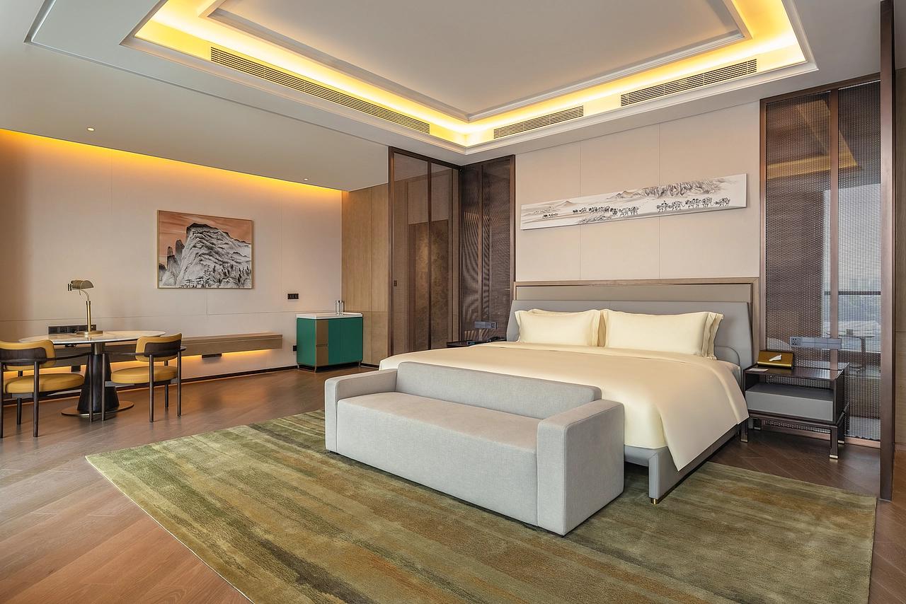 提取蜀地文化中的青、金、暖棕、米白作为主色调体系。以青点缀公共区域的软装,如大堂沙发、客房背景墙,传递雅致古韵;金用于灯具、五金件的细节,如客房床头的飞鸟造型铜灯,提升轻奢质感;暖棕铺陈于地板、家具,营造温暖底色;米白作为基础色贯穿墙面、床品,平衡色彩张力。在此基础上,针对不同功能区做色彩微调和,例如健身房以活力橙提亮,书吧则以墨绿营造静谧感,让工装设计在色彩维度既具统一调性,又能精准服务场景情绪。
