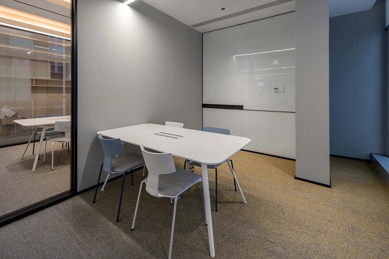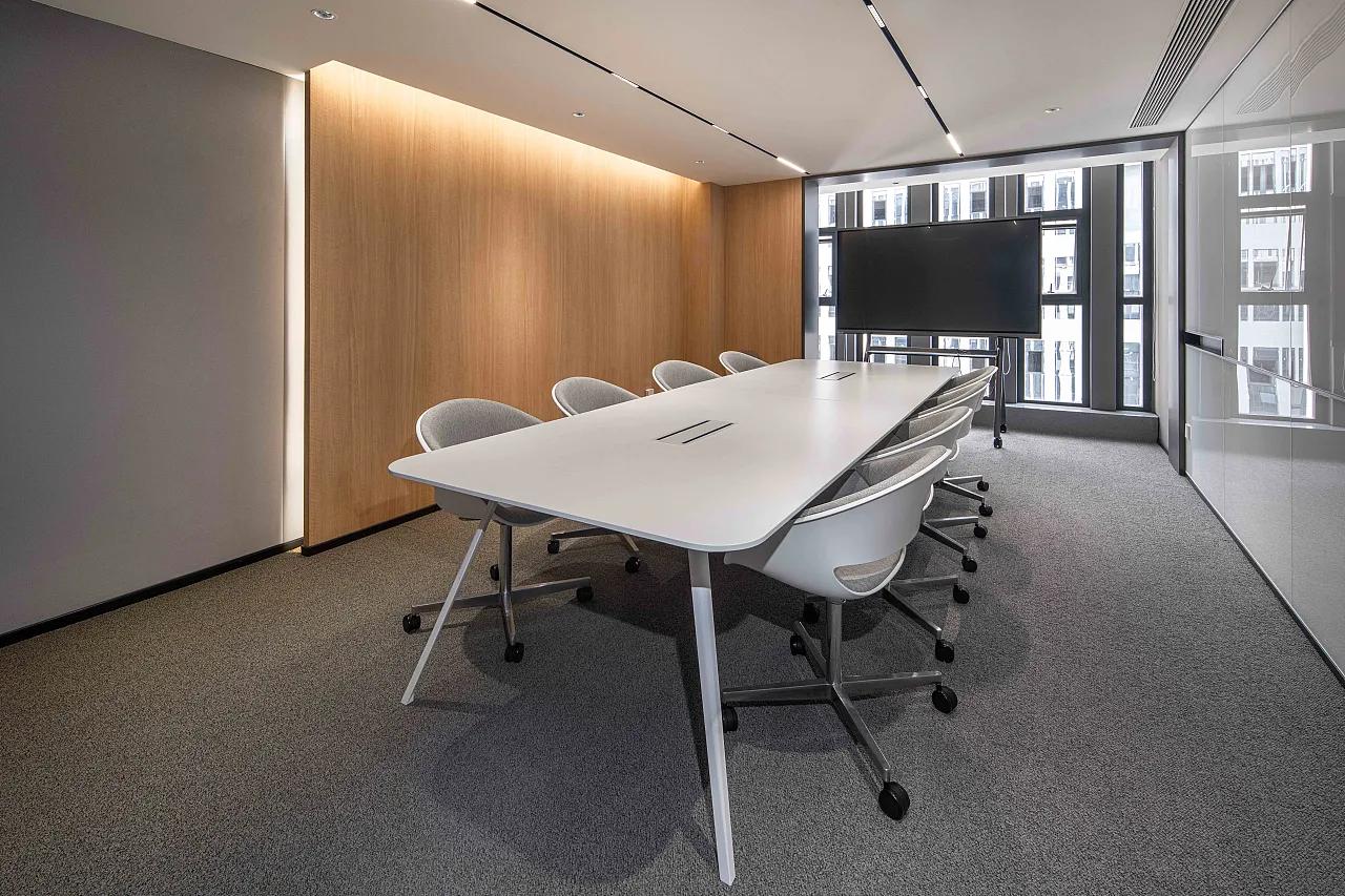 工装设计的质感,藏在材质的选择与色彩的搭配里。该项目以“中性基调 + 质感材质”为核心,塑造出专业且具温度的办公气场。色彩体系以灰色、白色、木色为 “铁三角”。地面地毯选择不同灰度的编织纹理,既实现了 “分区隐形边界” 的功能,又通过纹理的细腻变化提升空间层次;墙面的浅灰与白色乳胶漆,为办公场景奠定 “冷静、专注” 的情绪底色。而木饰面的局部介入,则像一剂 “温暖调和剂”,柔化了工业化办公的冷硬感,让空间在专业之余,透出人文温度。