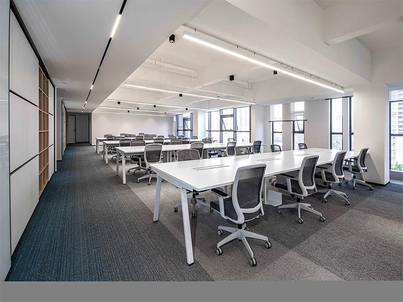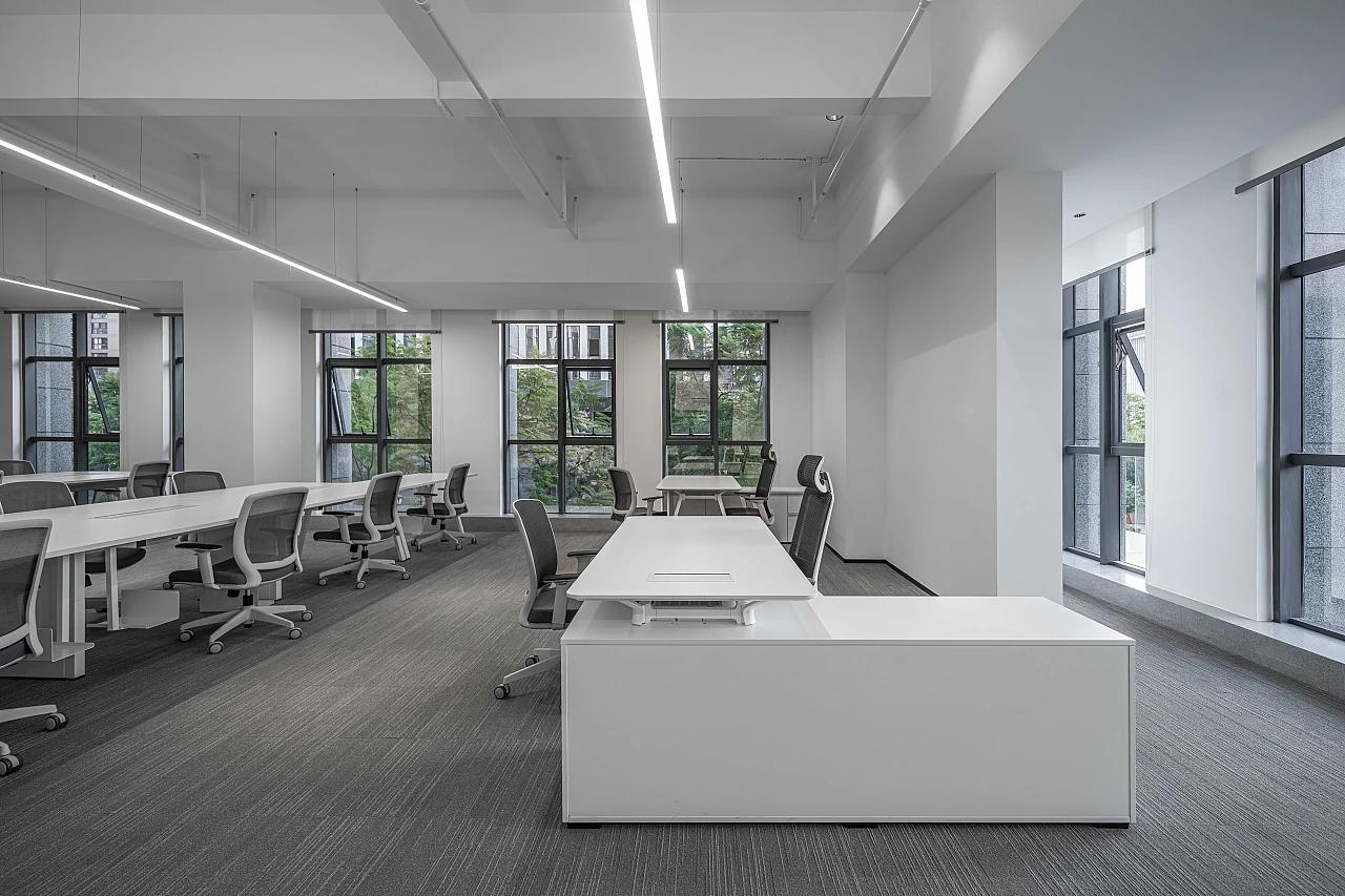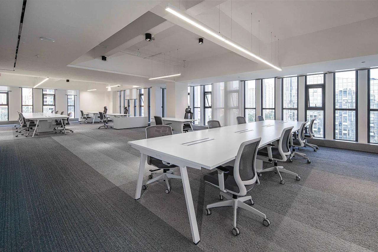 这处办公室的设计深度践行 “分区而治” 的理念,将 1400 平的面积拆解为会议室集群、开放办公区、辅助功能区三大板块,每个板块都精准匹配办公场景的需求。会议室系统构建了从 “大型决策会议” 到 “小型头脑风暴” 的全场景覆盖。开放办公区是 “协作文化” 的具象表达。通长的白色办公桌椅呈矩阵式布局,最大化利用空间的同时,为团队协作预留了充足的物理接口;人体工学椅的滑轮设计,让员工可随时组建临时讨论组,打破物理边界。大面积落地窗将自然光线引入室内,与线性灯带的人工照明形成互补,既减少视觉疲劳,又让空间在白天呈现出 “光影流动” 的动态感 —— 这种光线设计,是对武侯区亚热带湿润气候的巧妙回应,即便在多云天气,办公区也能保持明亮通透。