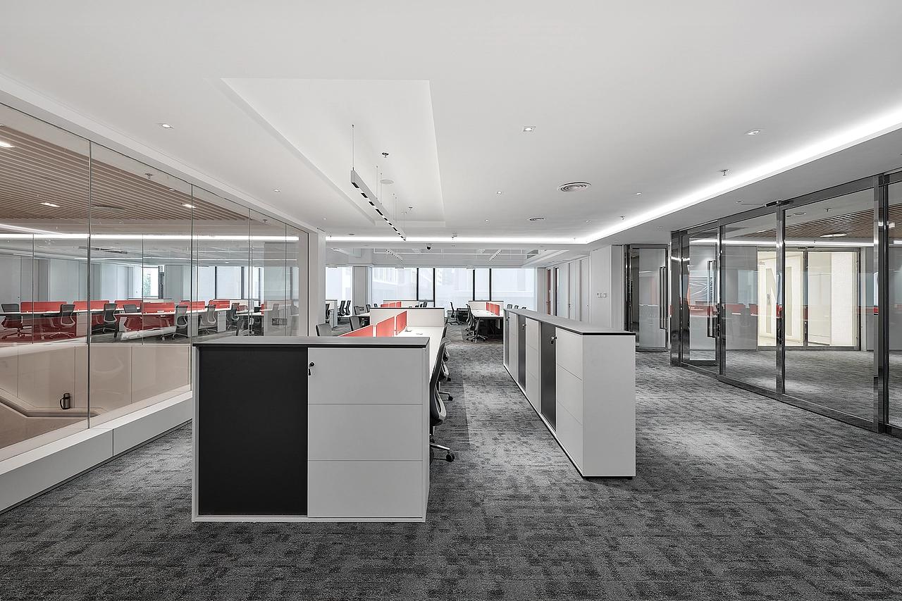以黑白灰作为空间的基础色调,构建理性、专业的办公底色 —— 白色墙面拓展视觉边界,灰色地毯柔化空间硬度,黑色金属线条勾勒功能分区。在此之上,橙色红色等亮色作为点缀,如同一支支活力音符,打破黑白灰的单调,为理性办公注入人文温度,让员工在视觉刺激中保持工作热情。