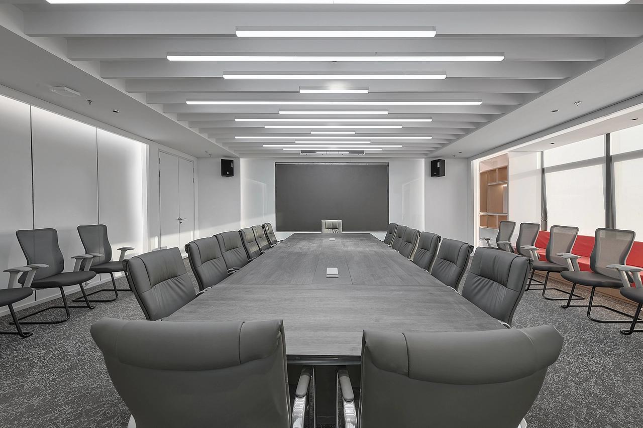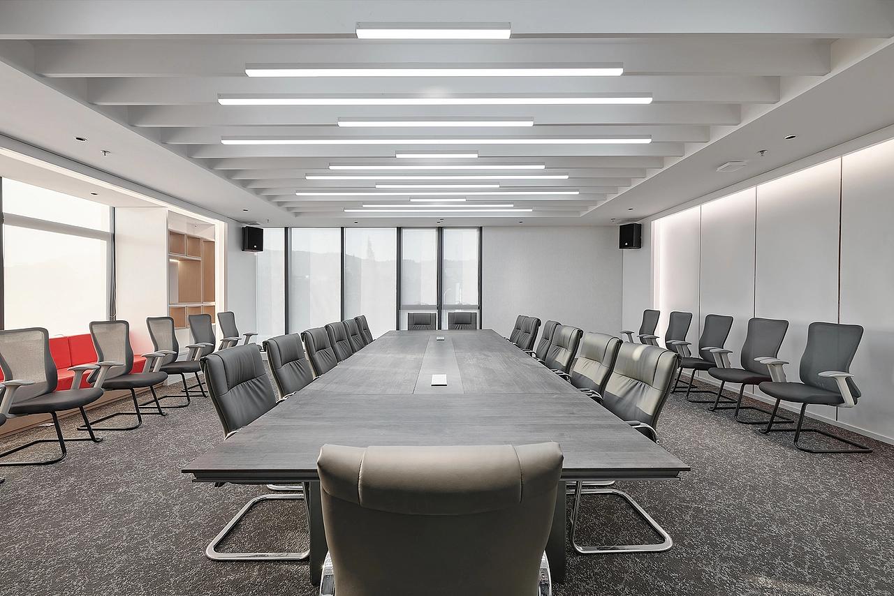 两套规格不同的会议室,精准覆盖企业从 “高层决策” 到 “部门协作” 的会议需求。大型会议室以超长木质会议桌 + 皮质办公椅构建商务气场,顶面线性灯带嵌入结构梁间,拉伸空间纵深感的同时,为多人会议提供充足且均匀的照明;音响、投影幕布的专业配置,让商务洽谈、方案演示高效落地。小型会议室则弱化形式感,以灵活的桌椅布局适配头脑风暴、客户接待等场景,与开放区的视觉联动,进一步强化空间的通透感。