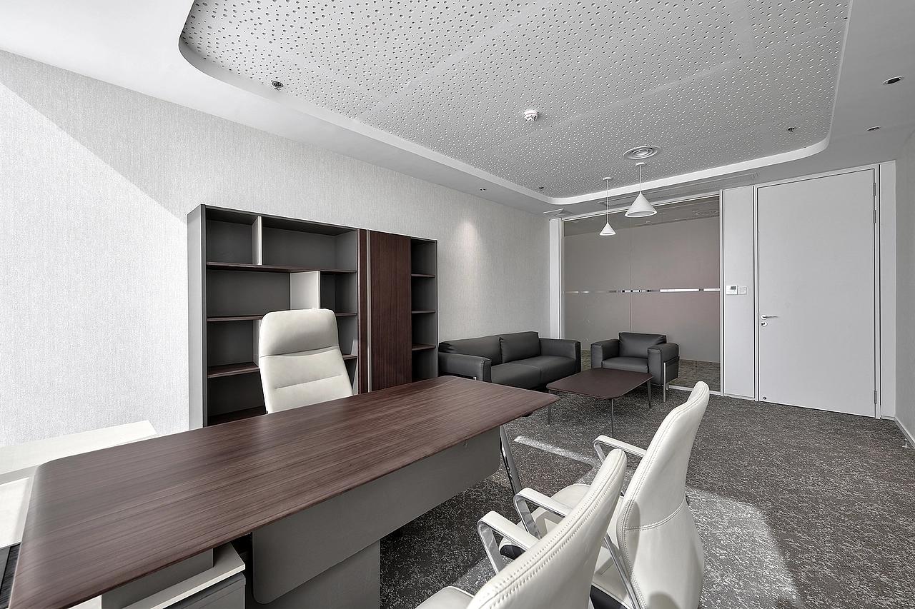 总经理及核心部门的独立办公室,以深色木质办公桌 + 白色皮质办公椅塑造沉稳专业的办公氛围。定制化的木质收纳柜兼具展示与储物功能,可陈列企业荣誉或个人藏品,传递品牌沉淀与个人风格;配套的灰色布艺沙发洽谈区,为商务会客、内部沟通提供舒适且私密的场景,让决策与交流在松弛感中高效推进。顶面穿孔吊顶的设计,既在视觉上打破单调,又通过穿孔结构优化声学环境,让独立空间的沟通更清晰流畅。