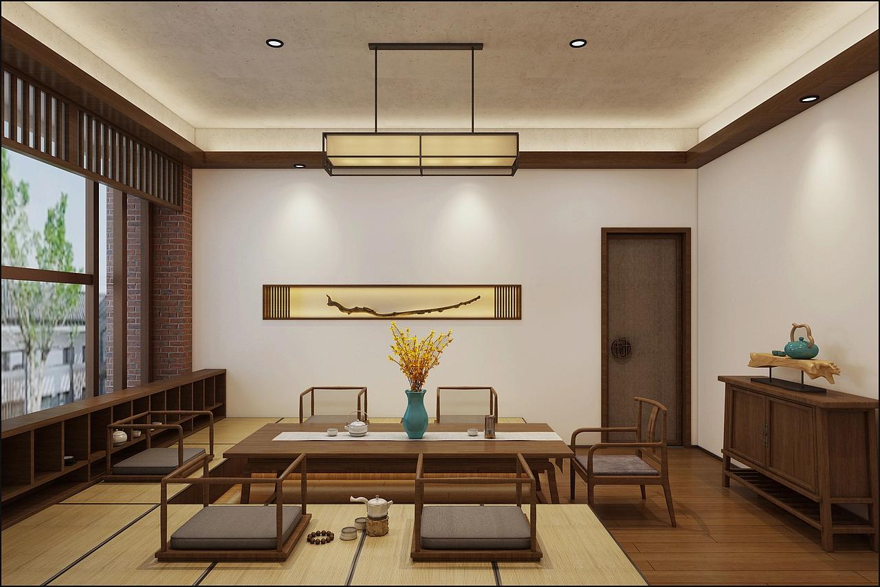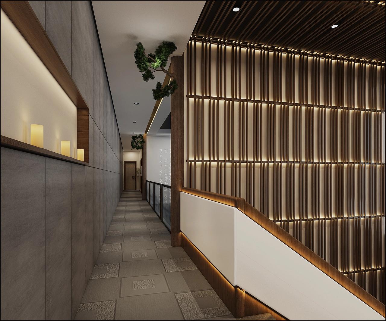 650 平的空间被拆解成 “层层递进的茶境”:公共区域用木格栅与纱帘做软隔断,既保留了开阔感,又给茶客留出了私语的距离。灰石地砖嵌着细碎的纹理,踩上去像踱过青城山道的青石板;立柱旁斜倚的青松配着白砂石景,是枯山水的留白,也藏着西岭雪的淡远 —— 这里没有传统茶楼的厚重雕花,取而代之的是线条利落的茶桌,原木的温厚裹着竹编灯罩的暖光,把茶汤浸成琥珀色,连风穿过格栅的声音都慢了下来。