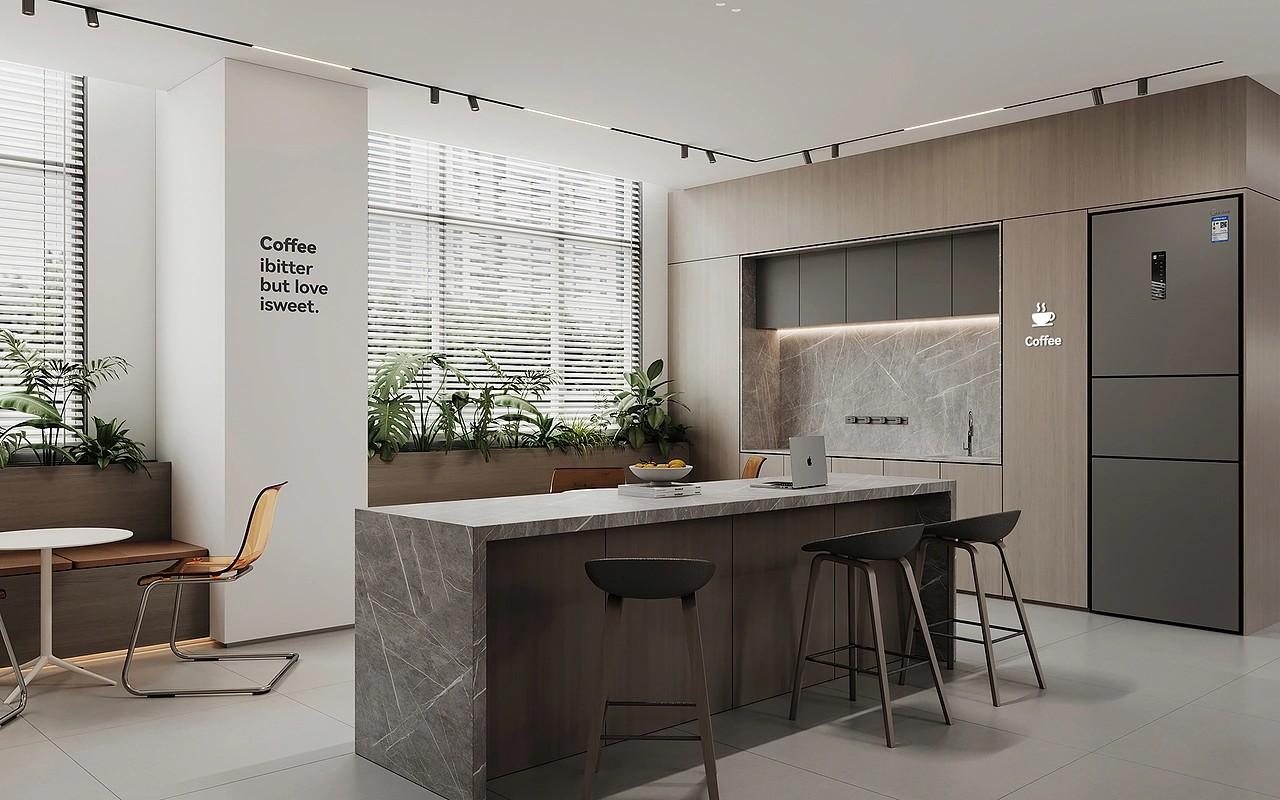 而成都式的 “温润”,则通过木饰面与暖色调实现平衡:茶水间的岛台采用胡桃木纹理面板,开放办公区的工位挡板加入浅橡木元素,再辅以品牌专属的橙色软装,让 “科技商务” 的冷感被自然的温度包裹,恰好契合新媒体团队 “理性创作 + 感性表达” 的双重属性。