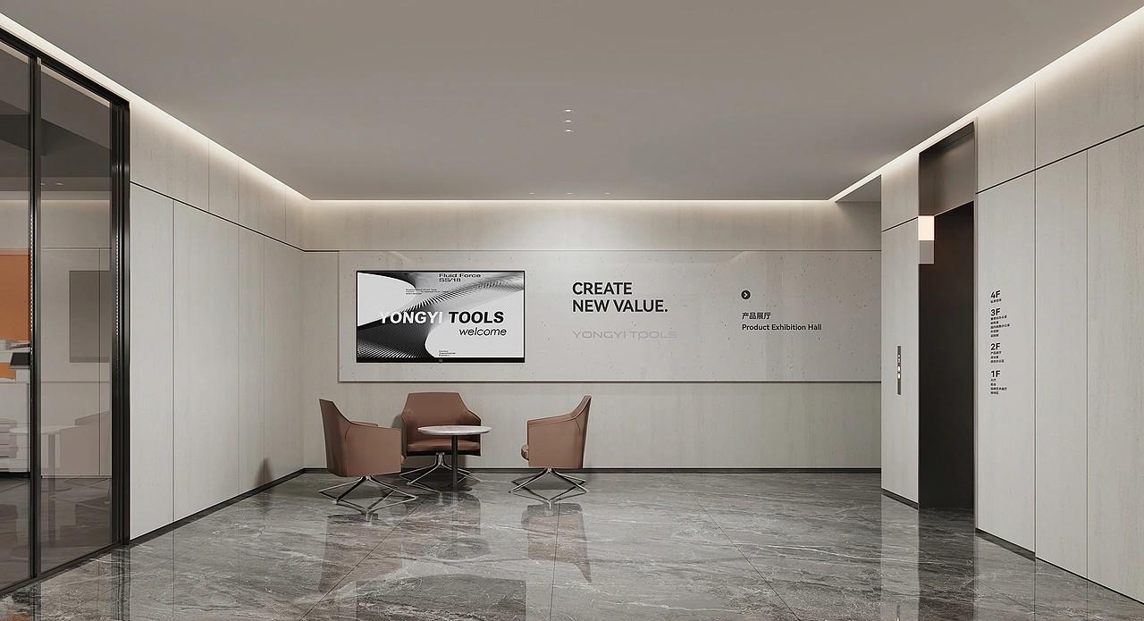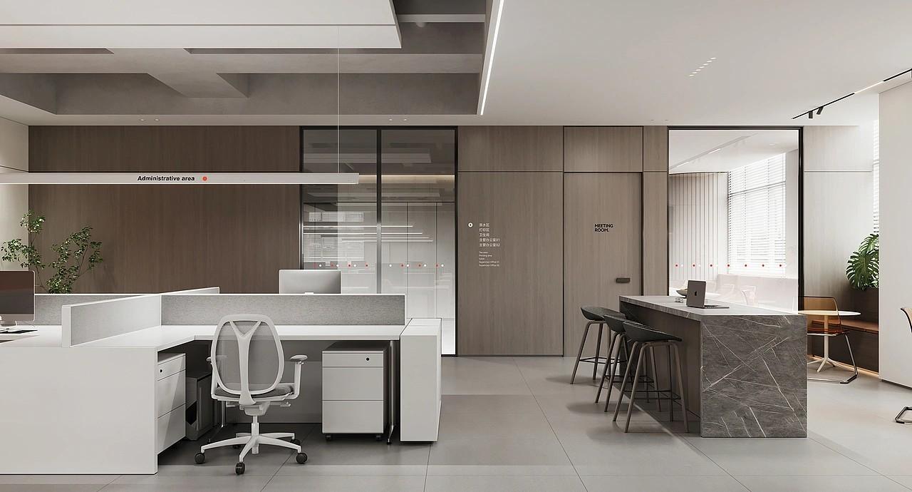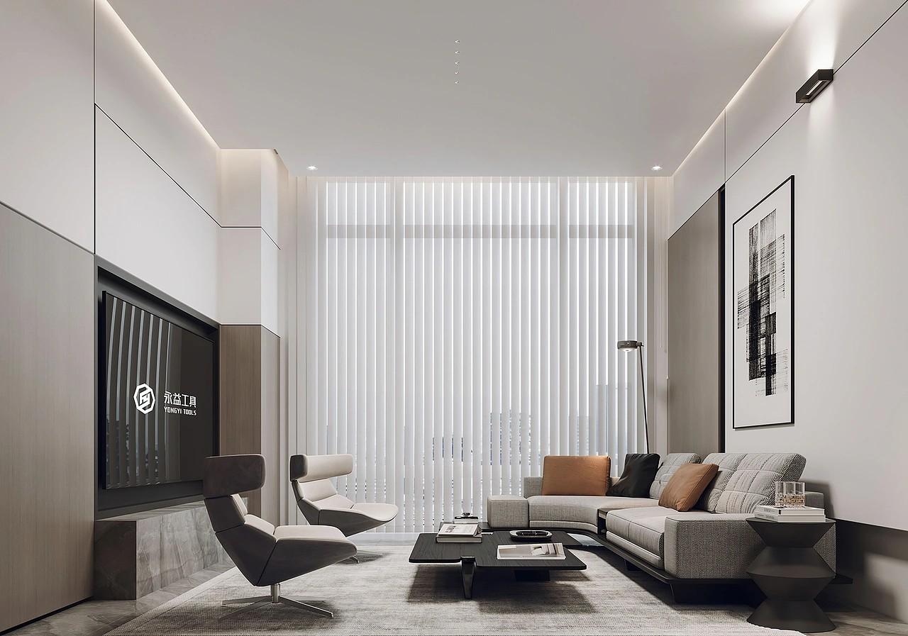 接待区则是企业形象的 “无声名片”:极简白墙嵌入发光的地面采用 800×800mm 深色大理石,搭配 3 组棕色皮质洽谈椅与圆形茶几,既符合商务接待的专业感,又以暖色调避免了空间的疏离;墙面预留的电子屏可循环播放品牌视频,让客户在等候的 3 分钟里,直观感知企业的技术实力与品牌调性。