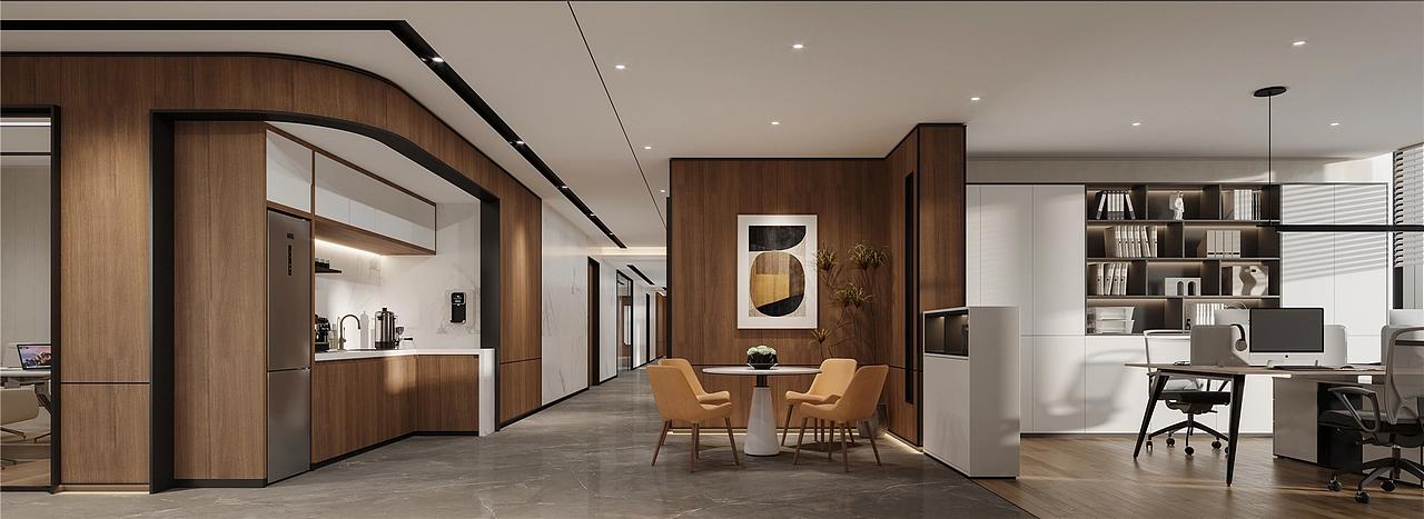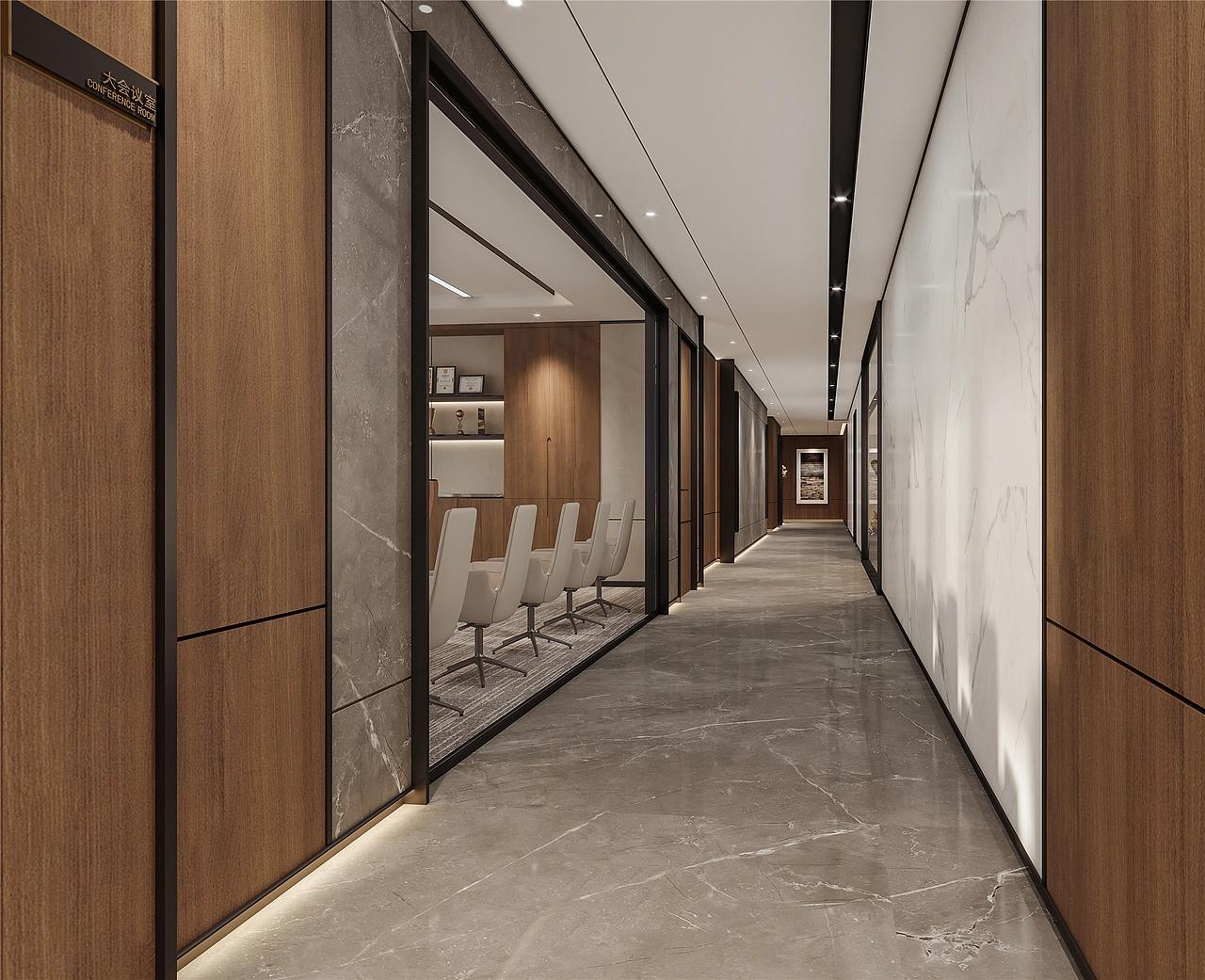 金融行业的办公空间需要传递 “稳重与专业”,这套设计以胡桃木纹理的木饰面为主基调 —— 从墙面装饰到柜体、家具,温润的木质肌理中和了写字楼空间的冷硬感,同时胡桃木的深色调自带高端属性,契合金融企业的品牌调性。为强化精致感,空间穿插浅灰色大理石:地面采用哑光大理石通铺,既保证耐磨易清洁的工装需求,又以细腻的纹理提升空间质感;墙面局部用大理石做装饰面,与木饰面形成 “暖柔 + 冷硬” 的材质对比,既不张扬,又暗显品质。