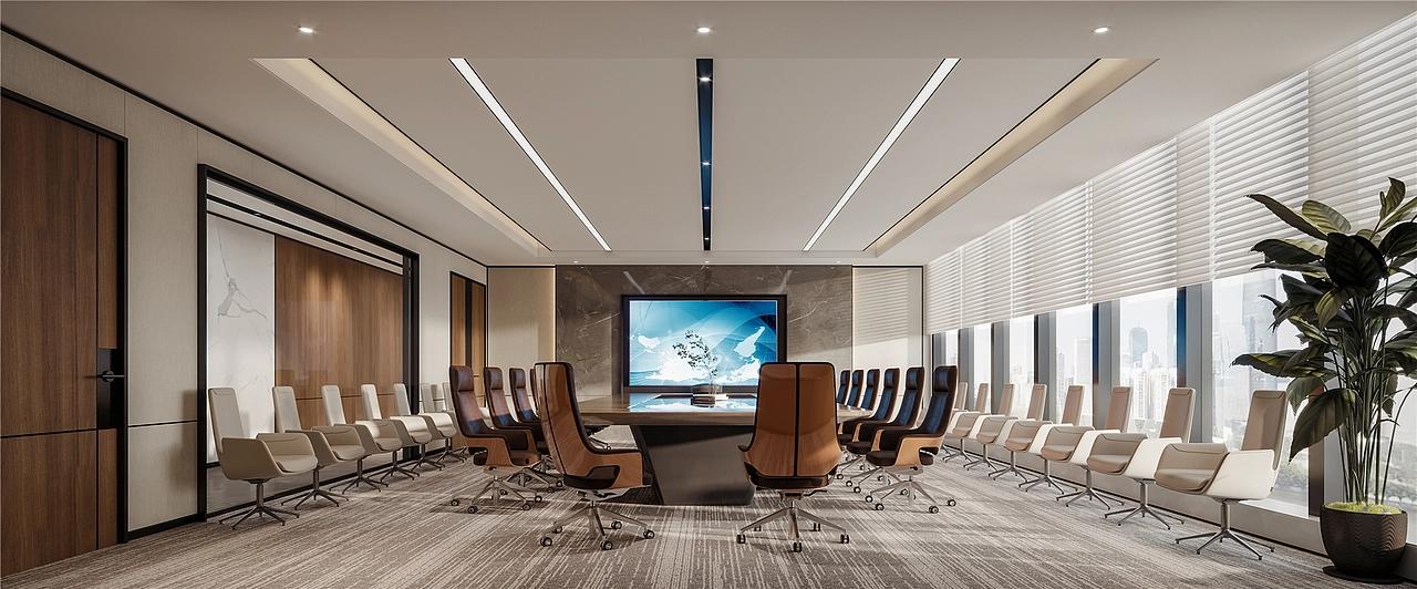 在接待区、走廊转角布置大型绿植,搭配木质家具的肌理,将自然感引入办公空间,缓解金融工作的紧张感;空间预留智能灯光、影音系统的线路接口,会议室配备智能投屏、远程会议设备,开放办公区设置无线充电工位,既符合现代金融办公的 “高效需求”,也体现了金牛区甲级写字楼的 “高端配套属性”。
