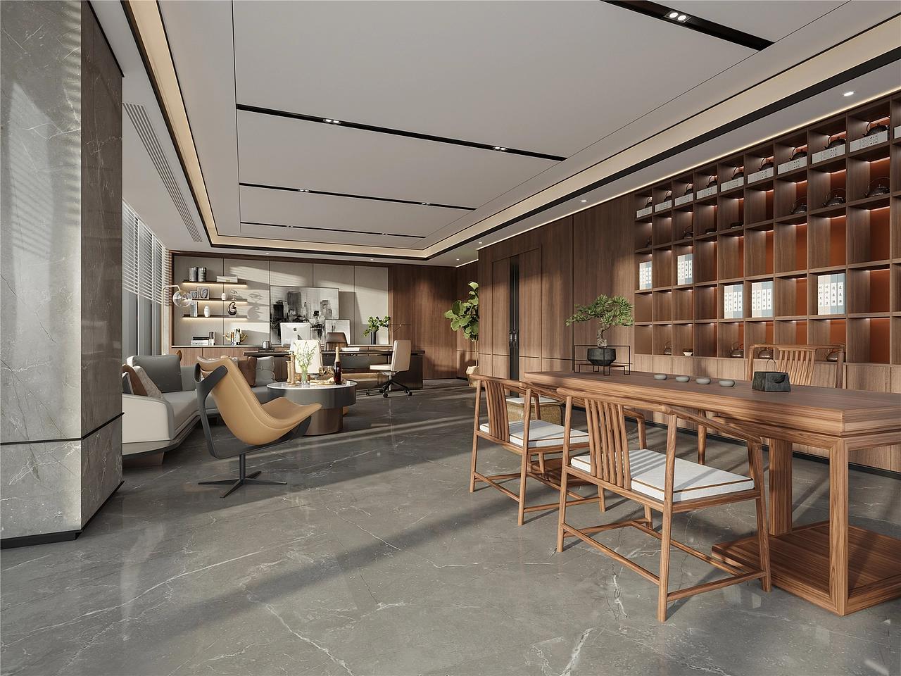 将开放办公区设置在空间中段,用玻璃隔断划分工位,既保证团队协作的流畅性,又通过玻璃的半通透感避免空间闭塞;独立会议室、董事长办公室则分布在空间两端,以实体墙 + 隐形门实现隐私性,同时在办公室与走廊的衔接处嵌入玻璃元素,保持视觉通透,避免 “封闭感”。