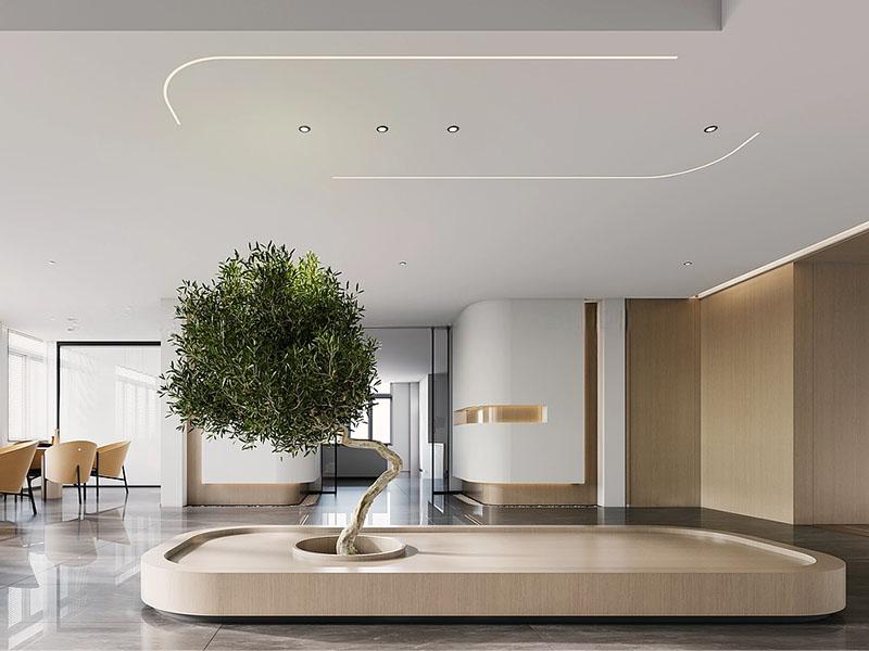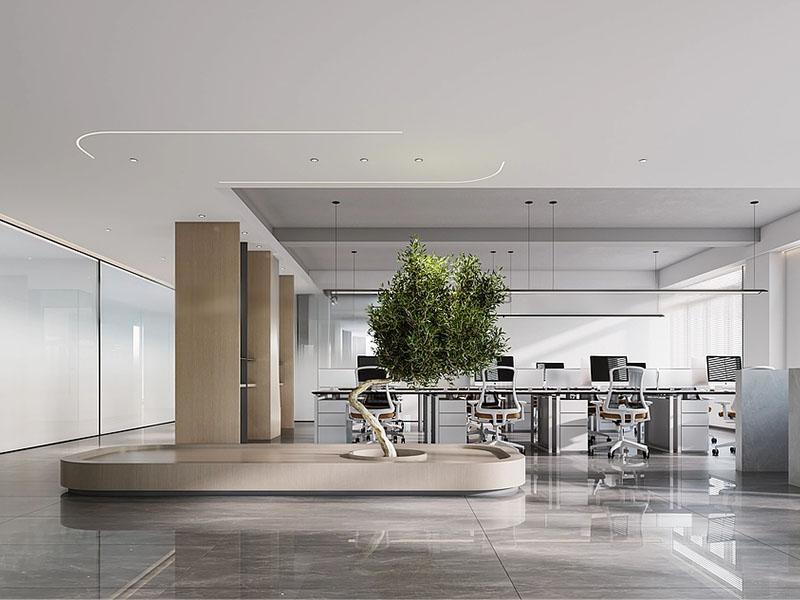 开放式办公区的设计则充分兼顾了高效协作与员工的舒适体验。浅灰色与木色的经典搭配贯穿始终,延续了整体空间的简约基调,线条感十足的吊顶灯整齐排布,既保证了充足的照明,又以简洁的设计语言强化了空间的秩序感。区域内点缀的大型橄榄树等绿植,为单调的办公环境注入了自然生机,有效缓解了员工的视觉疲劳与工作压力。而玻璃隔断的会议室设计,既保证了内部会议的隐私性,又不会阻碍空间的通透感,让开放与私密形成合理分区,兼顾了团队协作的高效性与个人工作的专注度。
