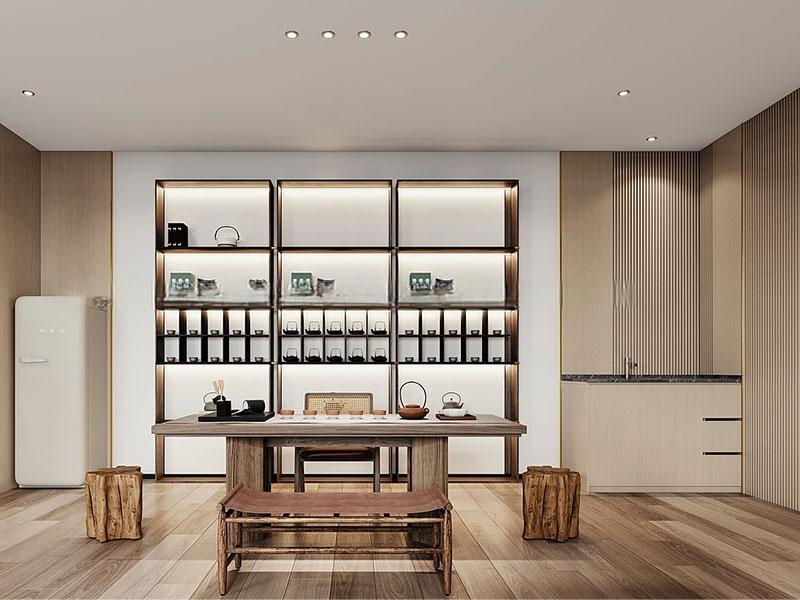 在注重商务属性的同时,壹西格玛也未曾忽略空间的人文温度,中式风格与现代设计交融的茶室便是最佳佐证。浅木色的柜体与原木茶桌营造出温润雅致的氛围,暖光照射下的展示柜中,茶具整齐陈列,既凸显了中式茶文化的静谧底蕴,又兼具实用收纳功能。搭配造型自然的树桩凳,让整个茶室充满自然气息,右侧简约的水台设计则兼顾了使用的便利性,在这里,无论是午后片刻的独处品茶,还是小型商务茶叙,都能让人远离喧嚣,沉浸在静谧舒缓的氛围中,为高压的工作节奏注入一抹从容。