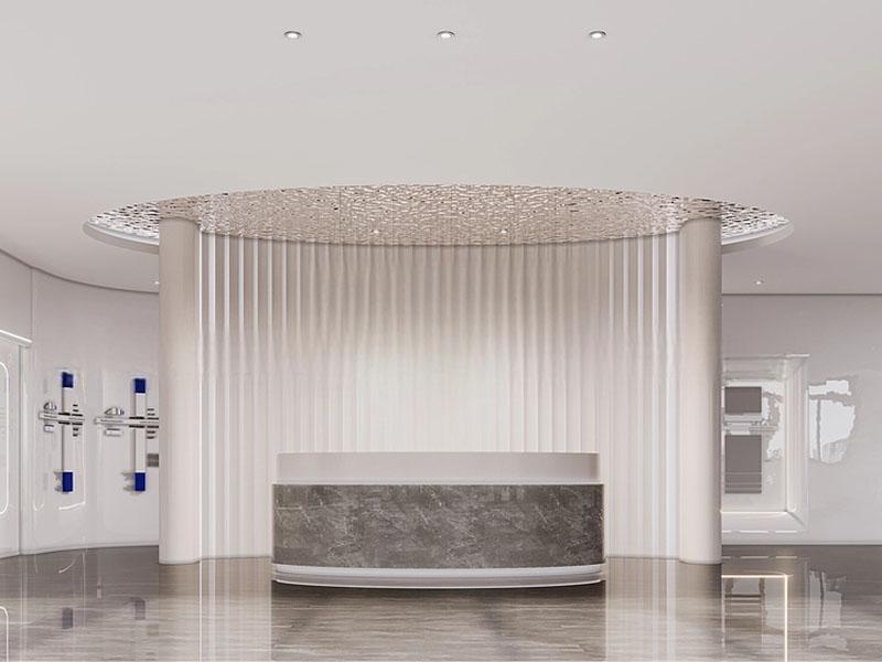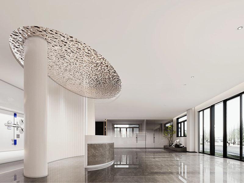作为企业“第一印象窗口”的公共接待大厅,集中彰显壹西格玛设计实力。设计以纯净白色为主调,奠定通透大气基调,搭配自然纹理大理石前台,大幅提升空间质感格调。针对大厅立柱的厚重感,团队别出心裁在立柱上方增设金属质感水波纹装饰,流动线条打破空间沉闷,以低调奢华感呼应整体设计风格。大面积的玻璃门窗将室外自然光引入室内,让空间更显开阔明亮,既消解了公共区域的拥挤感,也让到访者在光影流转中感受到企业的包容与活力。