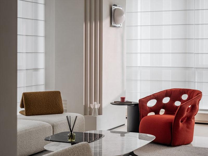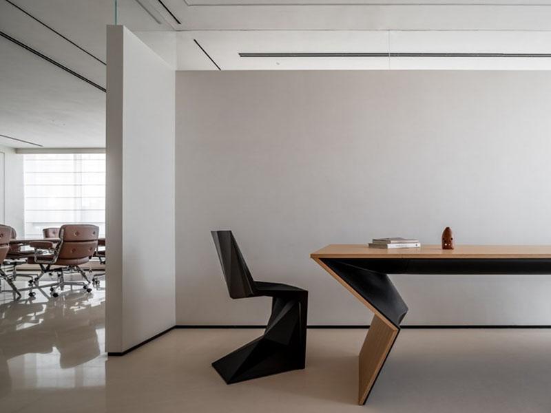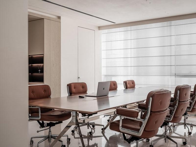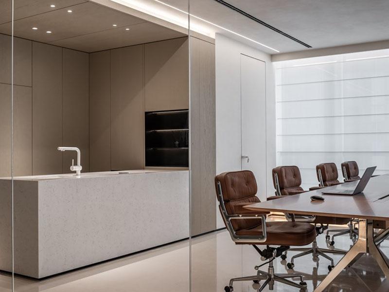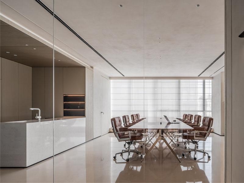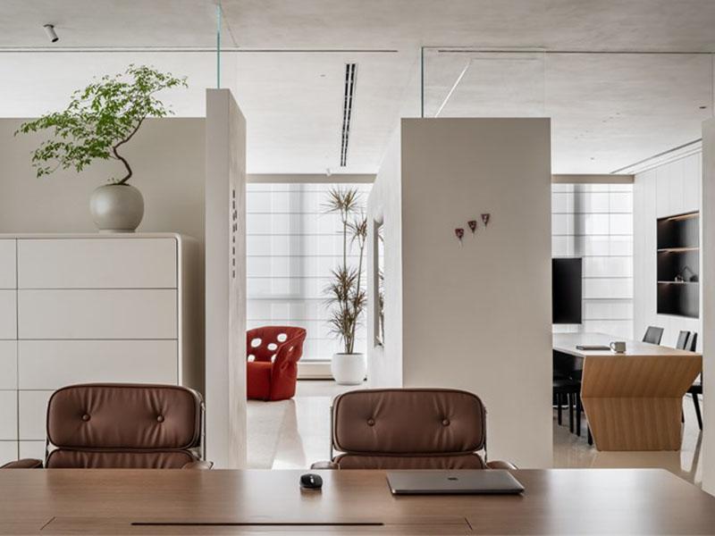 在风格营造上,壹西格玛以低饱和色调奠定空间基调,米白、浅棕与灰色的巧妙搭配,呈现出沉稳内敛的质感,再以焦糖棕皮质家具增添温暖气息,少量红色元素作为视觉亮点,让空间既简约不单调,又轻奢不张扬。材质选择上,品牌精选玻璃、哑光石材、木纹板材与金属等优质材质,通过不同材质的碰撞融合,呈现出细腻丰富的触感与视觉层次,进一步强化空间的高级感。此外,壹西格玛深谙灯光设计的重要性,采用隐藏式灯光布局,顶面线性灯与柜内氛围灯相互呼应,搭配百叶窗柔化自然光线,让空间光线均匀柔和,既保障办公采光需求,又营造出静谧雅致的氛围。