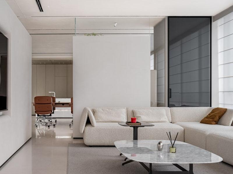 壹西格玛装修设计始终以企业需求为导向,将美学设计与实用功能深度融合,通过对空间分区、色调搭配、材质选择与细节把控的精准拿捏,打造出兼具商务属性与舒适体验的极简轻奢风办公空间,为现代企业重塑办公美学新范式,让办公不再局限于效率,更成为一种品质生活的延伸。