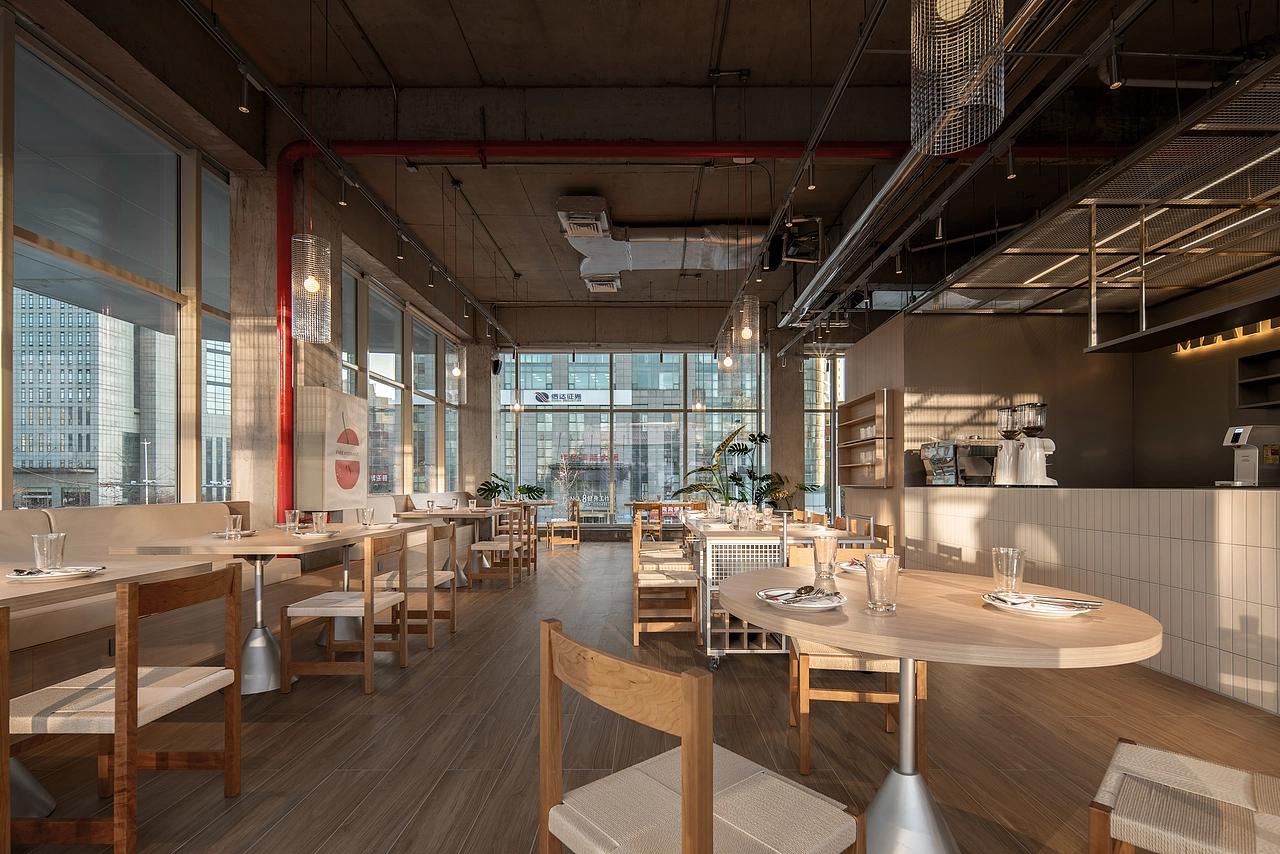 工装设计的温度,藏在 “硬基底” 与 “软细节” 的平衡里。为了避免工业风的冰冷,设计用自然元素完成了 300 平空间的 “柔化改造”:材质的暖感中和:地面通铺浅木色木纹砖,既保留了木材的温润视觉,又比实木更适配餐饮空间的防水、耐磨需求;桌椅选用浅橡木框架 + 棉麻坐垫,柔和的木质纹理与布艺触感,消解了工业材质的冷硬,让 300 平的空间既开阔又不空旷;
