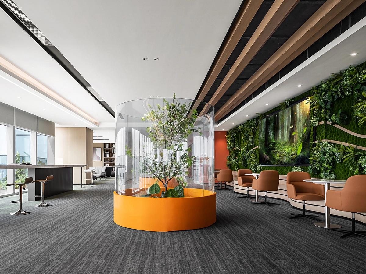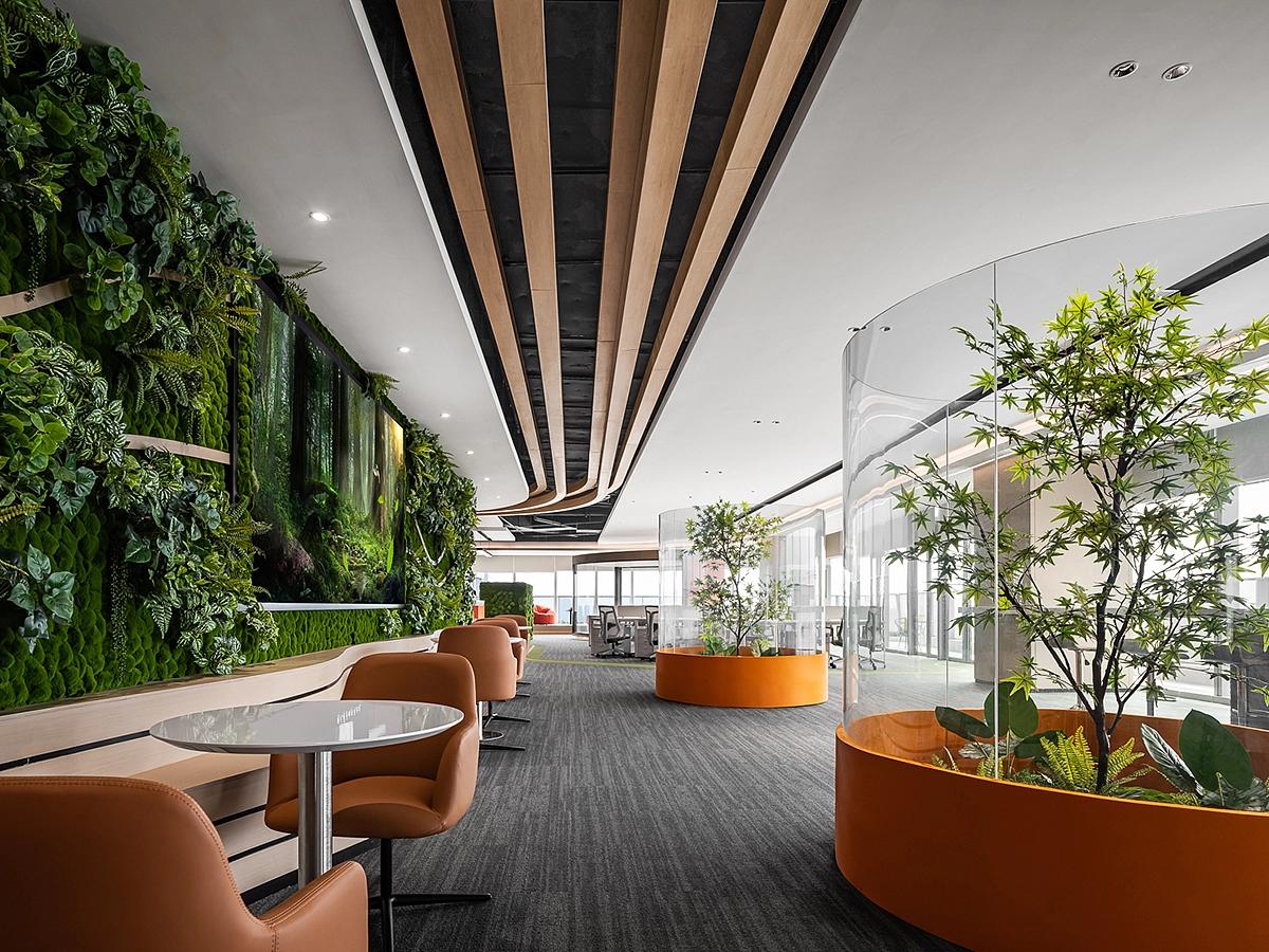自然生态的融入,是本次工装设计的核心亮点之一。设计团队以 “把森林搬进办公室” 为思路,在空间中植入多层次的自然元素:沿休闲区墙面打造整面垂直绿植墙,搭配仿真苔藓与蕨类植物,既软化了办公空间的硬朗线条,也为员工提供了视觉放松的 “生态缓冲带”;开放办公区与洽谈区的交界处,以橙色弧形花池搭配大型乔木,花池的圆润造型消解了空间的棱角感,绿植则成为区域间的 “自然软隔断”。同时,木纹装饰画、自然纹理石材茶几等细节,进一步强化了 “自然松弛” 的氛围,让高压的证券办公场景多了几分呼吸感。