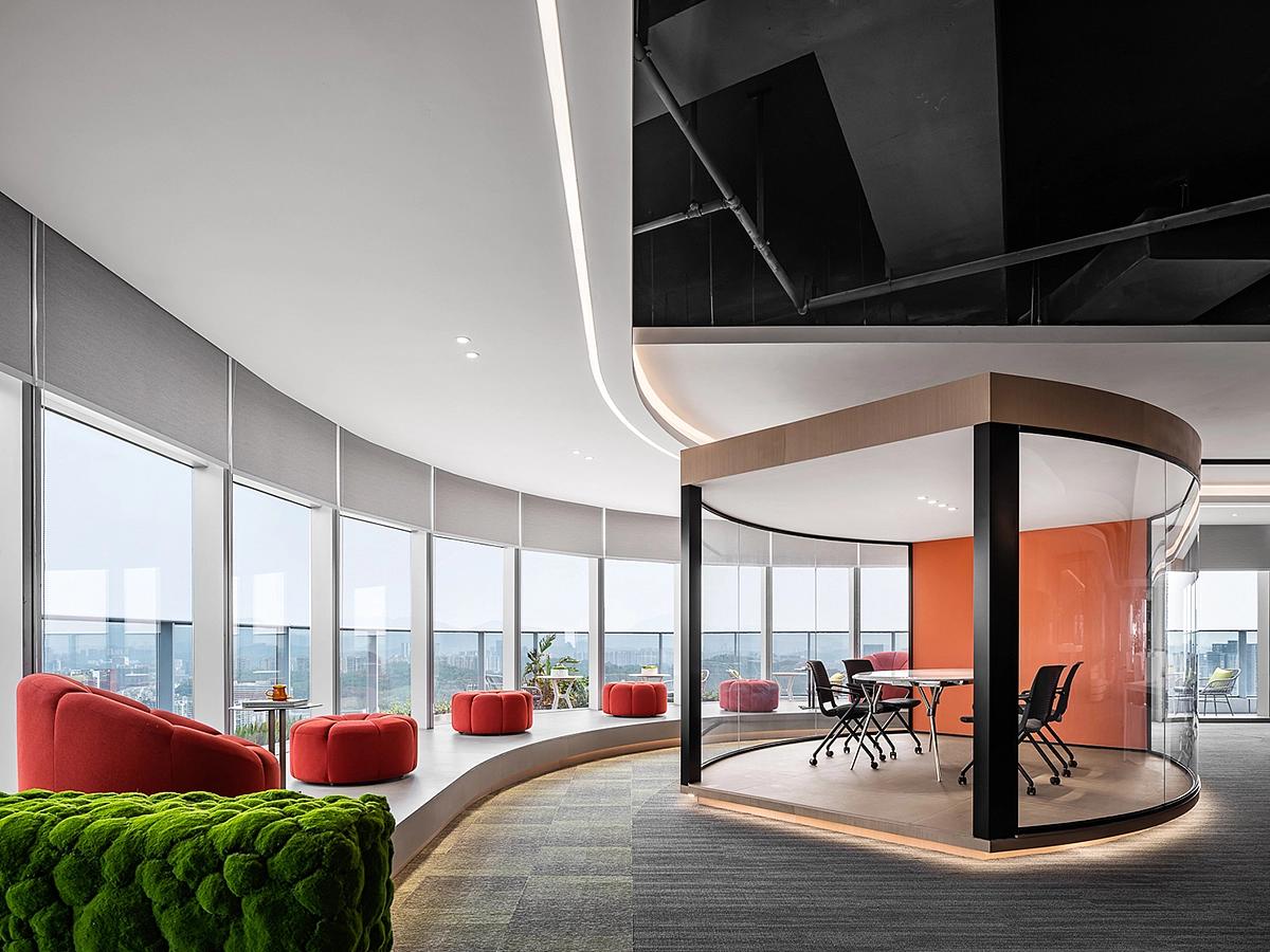 细节处的色彩与材质搭配,让空间更具层次感:局部高饱和色作为点缀,打破黑白灰的单调,同时呼应证券行业的活力属性;材质的对比则让空间更有质感 —— 玻璃的通透、金属的冷硬、布艺的柔软、绿植的自然,在同一空间中形成和谐的碰撞,既符合工装设计的耐用性需求,又通过材质差异提升了空间的精致度。