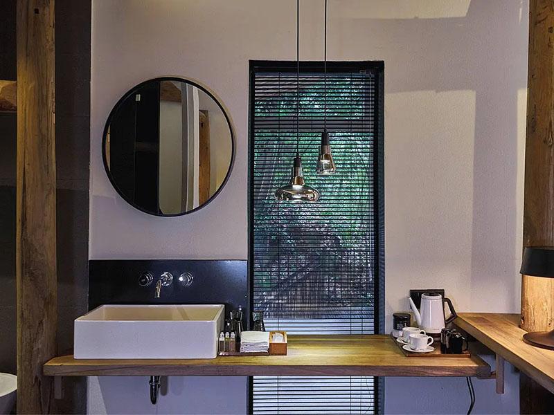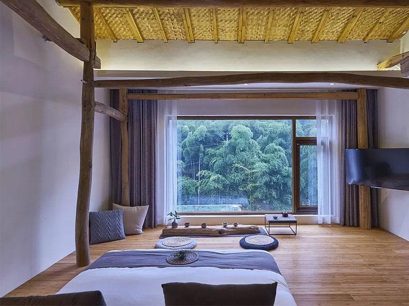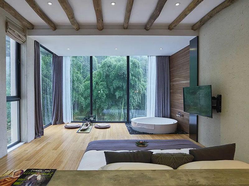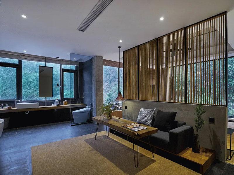 “把自然装进房间”,是壹西格玛在此次设计中的核心表达。围绕莫干山得天独厚的竹海资源,设计团队以全景落地窗为“画框”,将窗外连绵的竹林、起伏的山景转化为房间的动态装饰,让居住者推窗见绿,沉浸式感受自然之美。细节处更尽显匠心:茶台选用原木与枯木打造,搭配手工编织蒲垫,每一处材质都呼应自然主题;休息区与洗漱区的创意融合,景观浴缸与地暖设施的配套植入,既延续了自然静谧的氛围,又保障了现代度假的便利体验,实现了“诗意栖居”与“实用需求”的平衡。