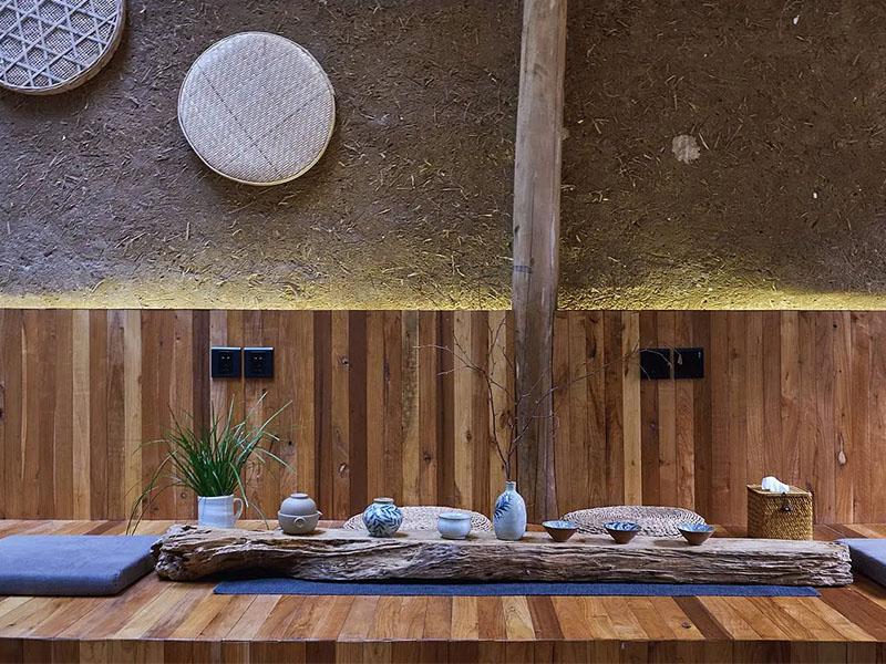 在壹西格玛的设计理念中,传统不是复刻,而是与现代的巧妙对话。设计团队深入挖掘莫干山本土建筑特色,将夯土墙、老木梁柱等原生元素完整保留,墙面清晰可见的稻草纹理,梁柱间沉淀的岁月痕迹,都成为空间的天然底色,唤醒人们对乡土的情感共鸣。与此同时,团队大胆融入现代设计元素:270°全景落地窗打破传统民居的封闭感,让阳光自由穿梭;金属吊灯与竹制隔断相映成趣,冷硬材质与自然肌理碰撞出独特韵味,既守住了乡野的质朴,又满足了现代人对居住舒适度的需求。