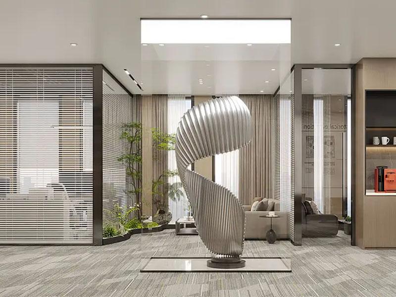 公共过渡区域与老板办公室的设计,更彰显壹西格玛的细节把控力。公共区域以大型金属雕塑为视觉焦点,玻璃隔断清晰划分空间边界,绿植造景柔化硬质线条,让过渡空间兼具引导性与艺术感;老板办公室则采用深棕木质办公桌搭配高背椅,凸显沉稳大气的质感,落地窗保证充足采光,简约沙发与茶几的组合满足临时洽谈需求,完美契合管理层办公场景的气质。