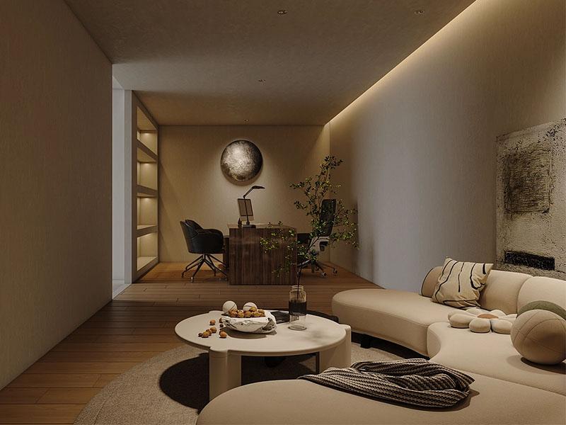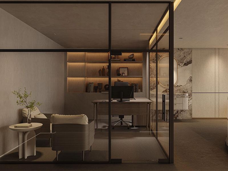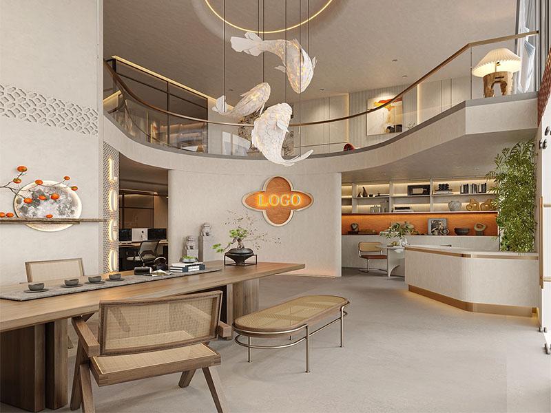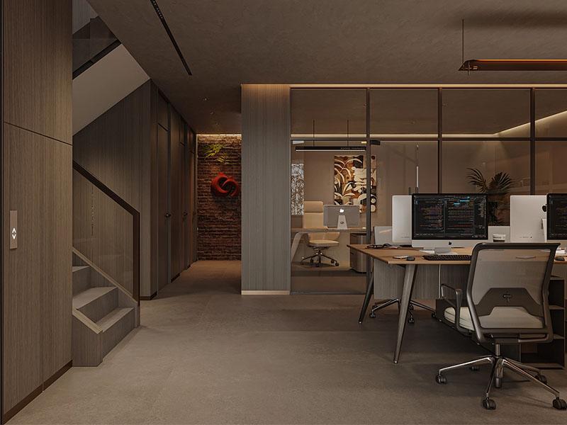 在功能分区的过渡地带,壹西格玛设计的休闲区域成为空间的点睛之笔。观景窗引入充足自然光,弧形设计柔化了空间线条,大理石与木色材质的搭配温润雅致,落地灯与软装的巧妙组合,让这里成为工作间隙舒缓身心的理想之所。兼具办公与会客功能的多功能区域,以浅色系沙发、圆桌与独立书桌构建核心布局,柔和的灯光笼罩整个空间,既适合小型商务沟通,也能满足专注办公的需求,实现了功能与氛围的完美融合。而商务接待区域则融入东方元素,锦鲤装饰与茶桌传递出东方韵味,与现代简约的柜体、灯光相得益彰,在彰显格调的同时,为商务洽谈营造出从容惬意的氛围。就连带楼梯的动线空间,壹西格玛也未曾忽视设计感,玻璃隔断清晰划分空间边界,工业风砖墙与现代家具的混搭,让动线不仅是通行通道,更成为空间设计的一部分,兼顾功能性与视觉美感。