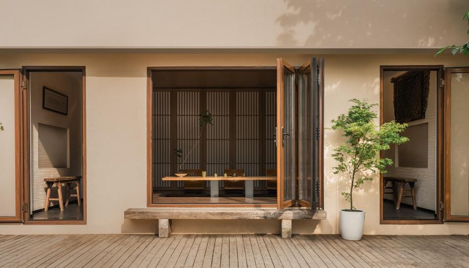 跨过门槛,将到访者与内部空间连接的是一洼掩映在葱郁绿植下的小水池。不用着急去给它下定义,转过角,往里再走上几步,右手边那栋房子大体的样貌便落入眼中。奶油色的外墙上好几面大大的玻璃被框在长条的木头里。素净的墙面,原木色的家具、大方清透的门窗。