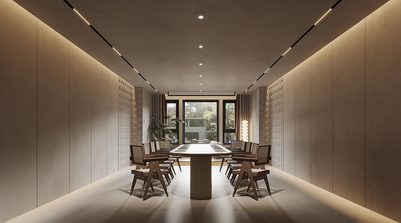 800 平的民宿空间,通过“通透 + 围合” 的布局,实现了公区社交与私区静谧的平衡。吧台与餐厨区连通,开放式酒柜与置物架既做功能分区,又保持视觉通透;顶面的线性灯带与造型吊灯形成层次,既满足照明需求,又让公区氛围松弛,适合客人休闲、交流;