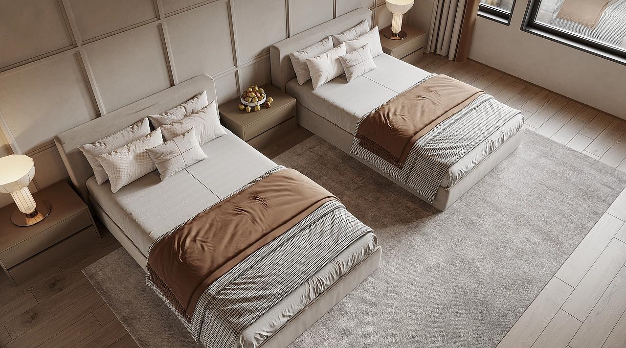 民宿整体采用低饱和柔和色系,以暖米色、浅木色、浅灰色为基底 —— 墙面选用微水泥质感的暖米色,自带 “侘寂” 的质朴肌理;地面通铺浅橡木纹地板,呼应青城山的林木意象;局部以焦糖棕、深木色做层次点缀,既避免了单一色调的寡淡,又保持了视觉的统一柔和,让客人踏入空间的瞬间,就能从城市的繁杂中抽离,被山林式的温柔包裹。