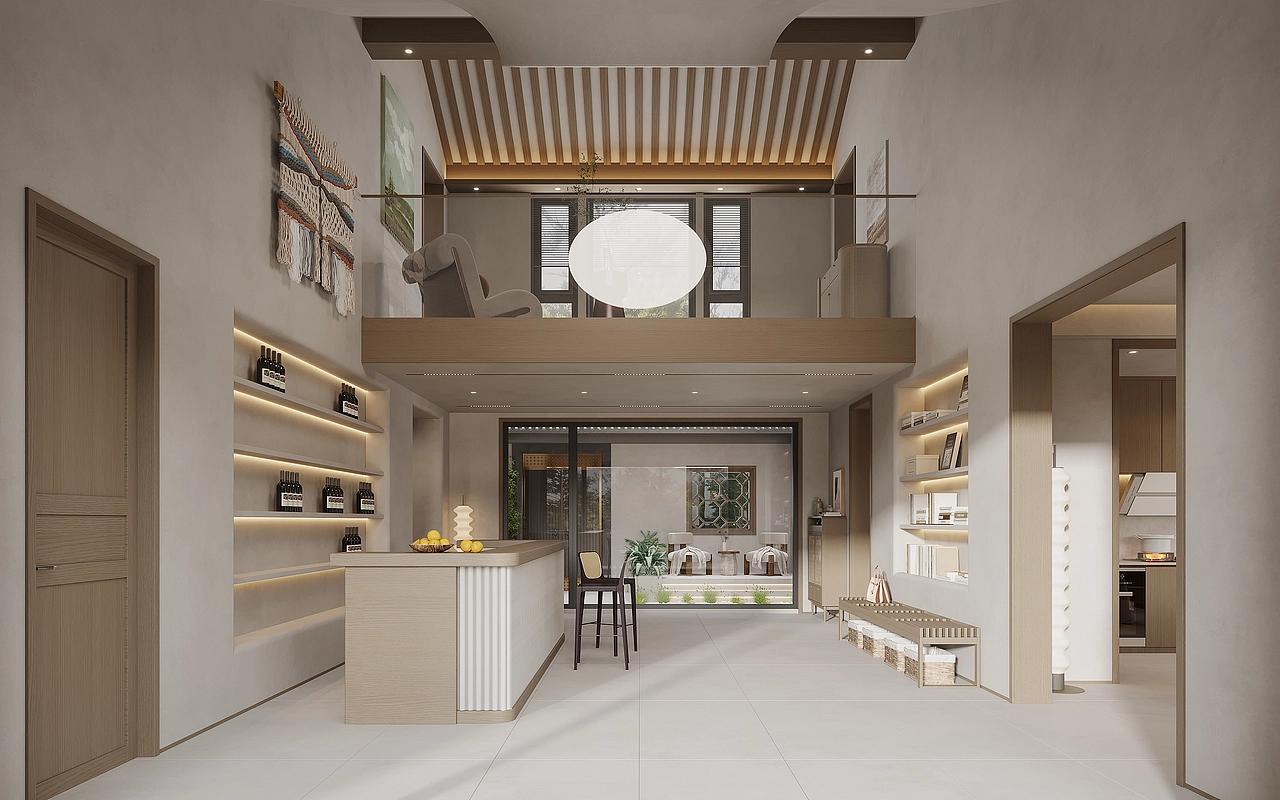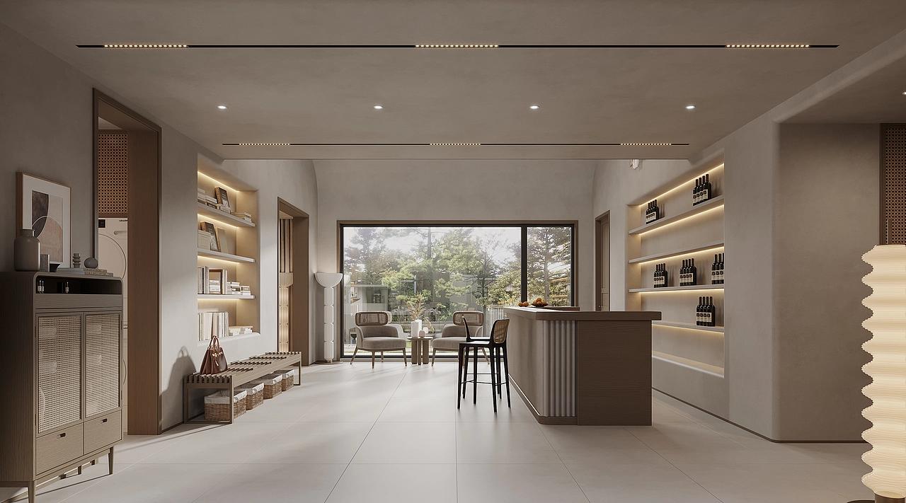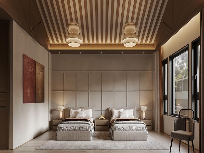 木质元素贯穿全场:吊顶采用木质格栅,既弱化了大空间的空旷感,又增添了新中式的雅致;家具、门柜选用仿原木材质,保留自然纹理的同时,兼顾民宿高频使用的耐用性;柔化材质提升体验:墙面局部做布艺软包,卫浴柜、吧台椅融入藤编纹理,微水泥材质覆盖墙面与台面,这些带有 “手工感” 的肌理,既呼应了侘寂风的质朴,又让空间触感更柔和;公区用柔光砖,防污易清洁;卧室、休闲区铺木地板,强化温馨感,不同区域的材质切换,既满足公装的功能需求,又让空间层次更清晰。